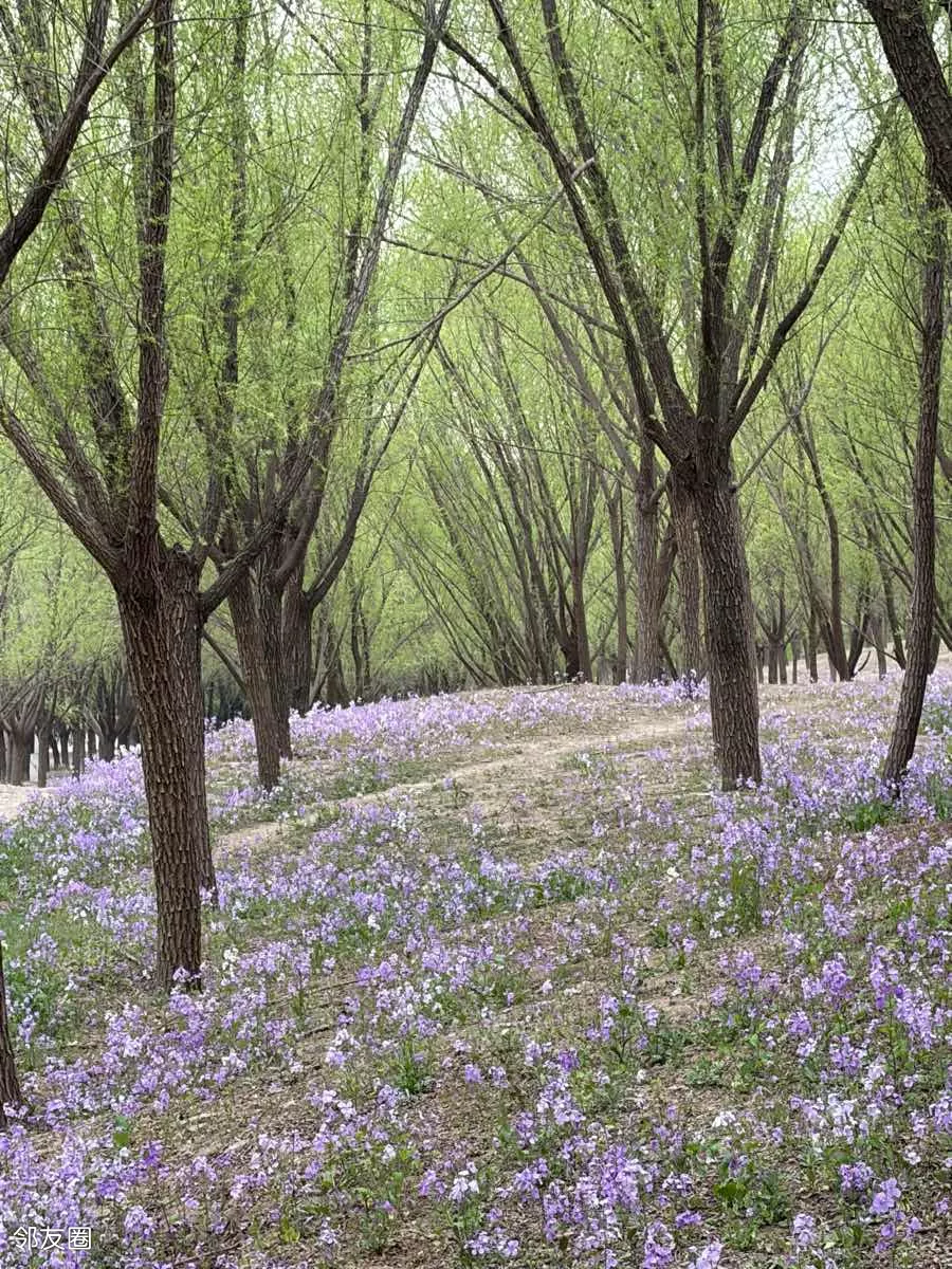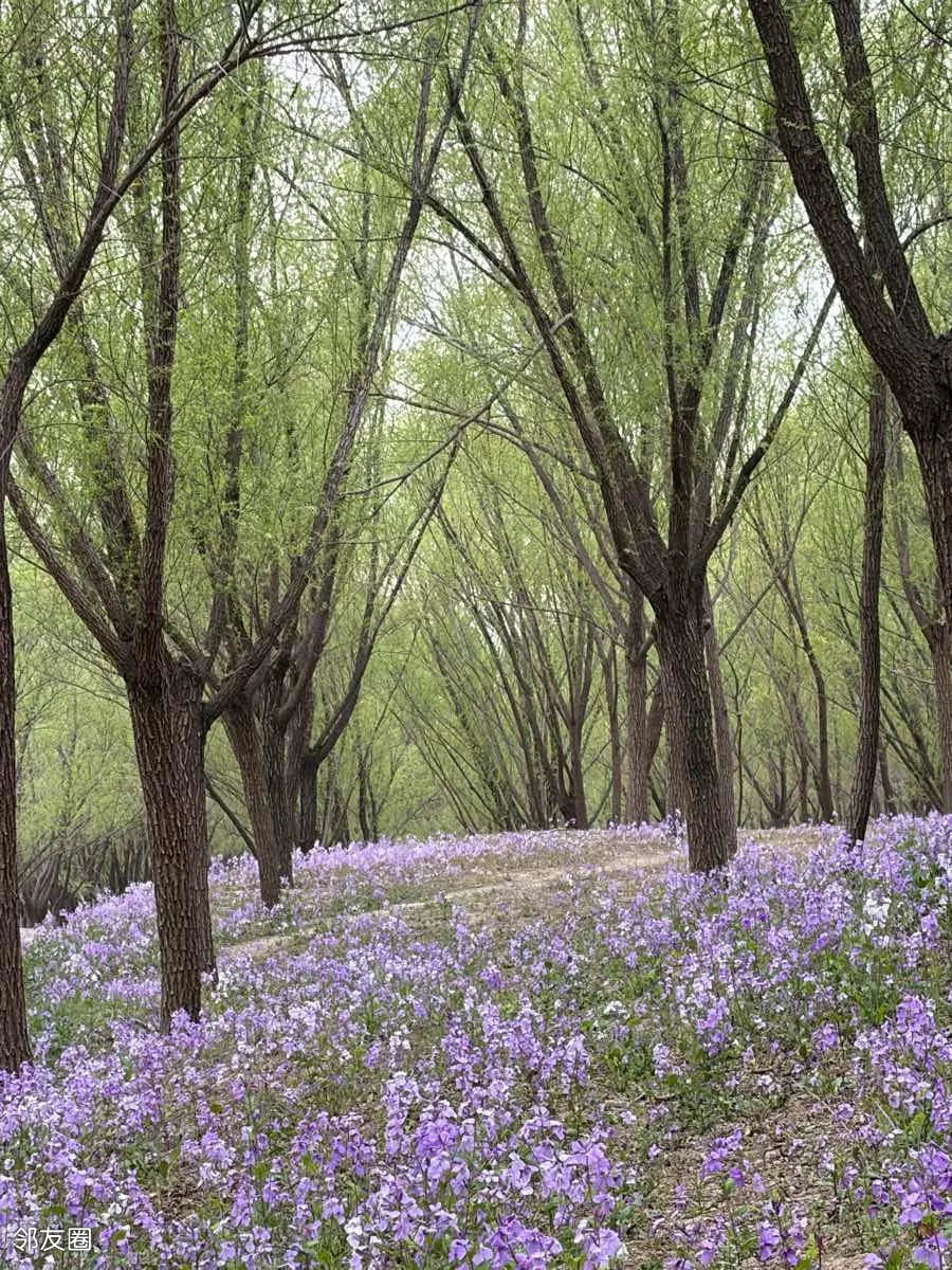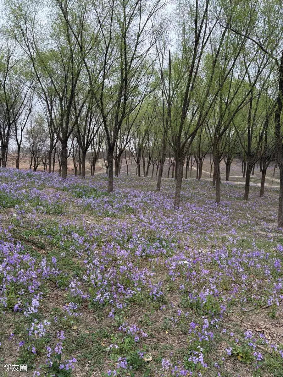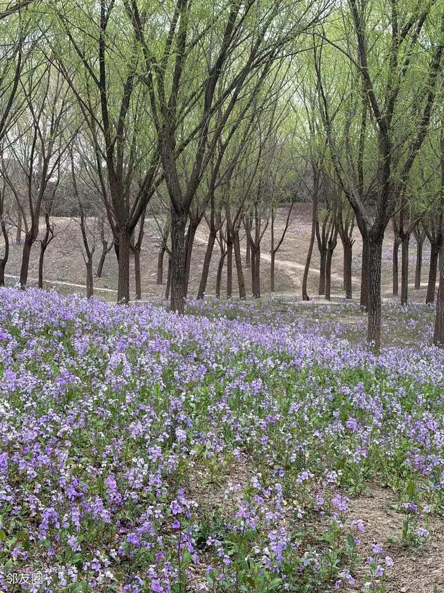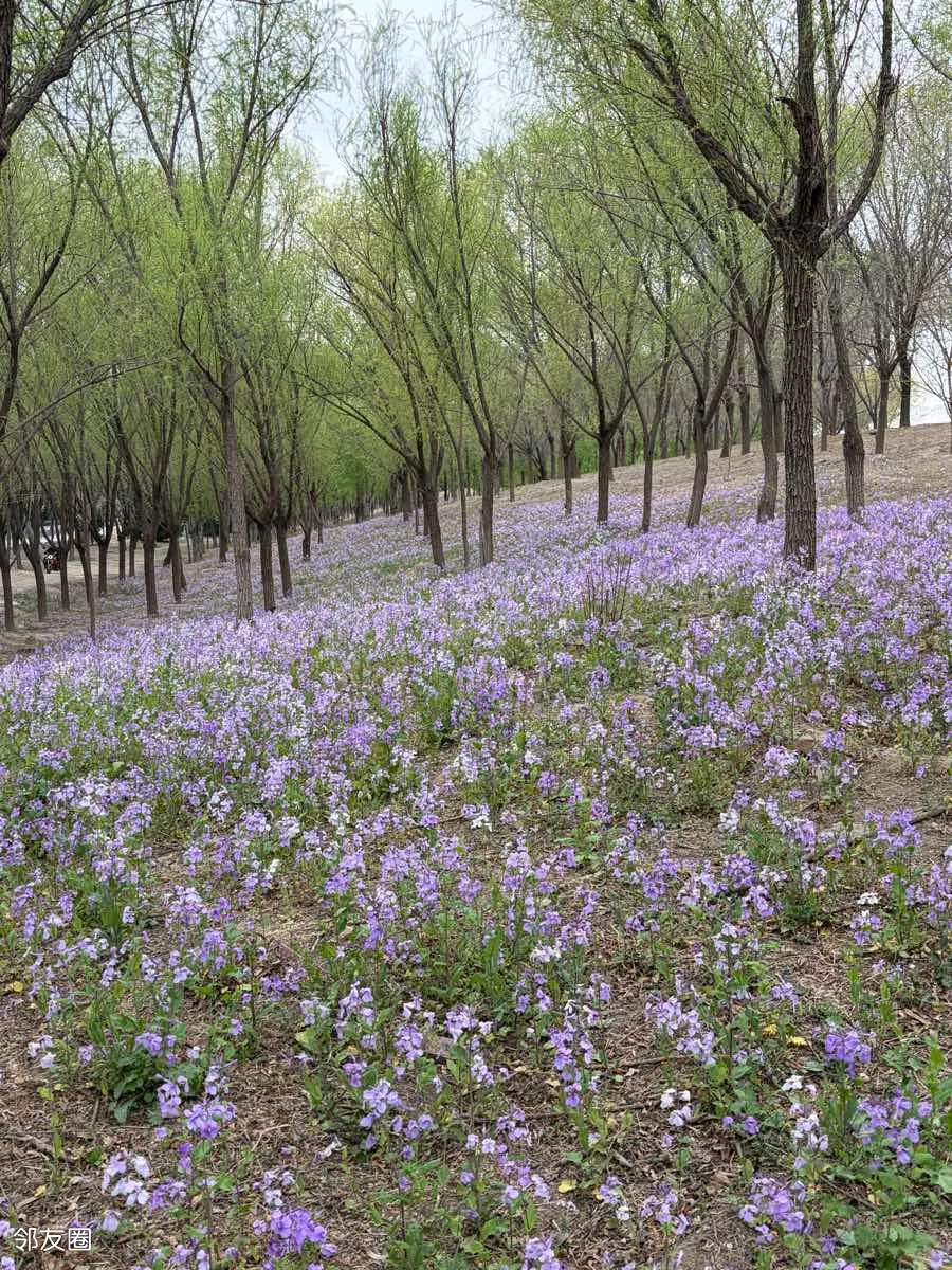 一抹蓝紫撞进眼帘,二月兰铺就的梦幻花毯,随风轻摇。