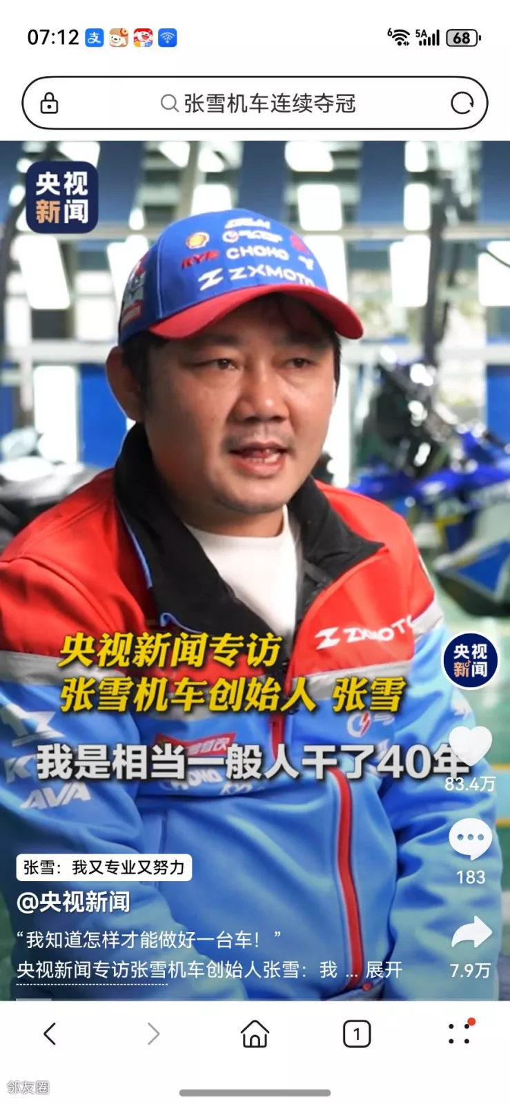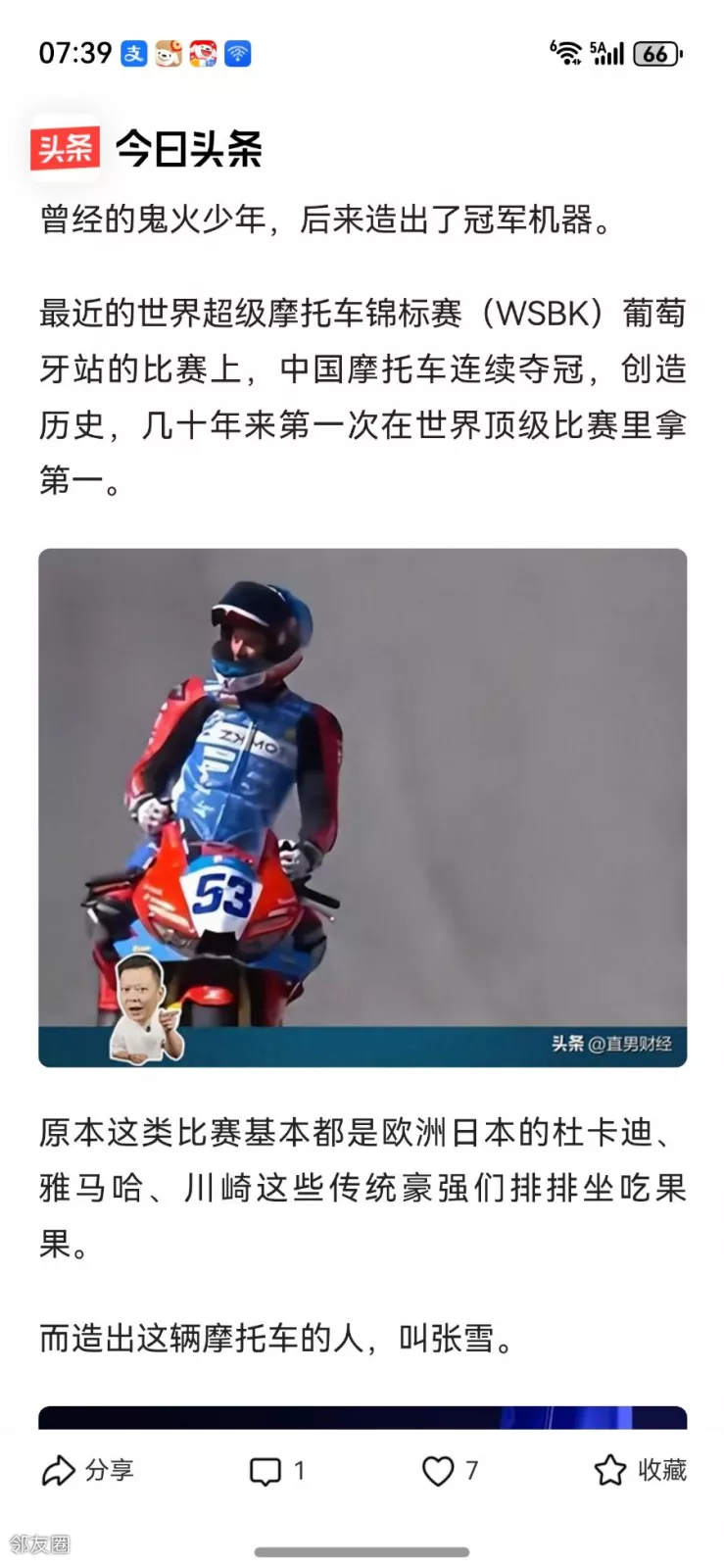 有没有人看到张雪的报道,这两天央视也对其进行了采访。这是一个应该被人们记住的名字,一个真正因为梦想坚持,因为对摩托车的热爱,他曾经想成为摩托车赛手,但是家境的贫寒,让他没有办法能参与。于是,他开始去修理厂修理摩托车,了解摩托车的配件,后来稍微有了点💰,开始做自己的修理厂,一直到开始自主研发摩托车的发动机,生产出自主品牌的摩托车勇夺WSBK两连冠。虽然他没有去赛场,但是他自主生产的摩托车让赛车手拿到了冠军,这个过程他走了20年,打破了欧日对机车的垄断,这一直是张雪的梦想,让世界看到了中国制造的力量和梦想的力量……多少有点飞驰人生里,梦想照进现实的味道。