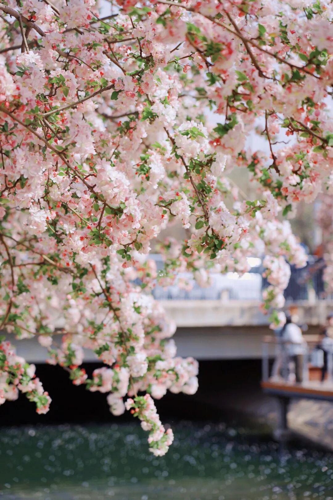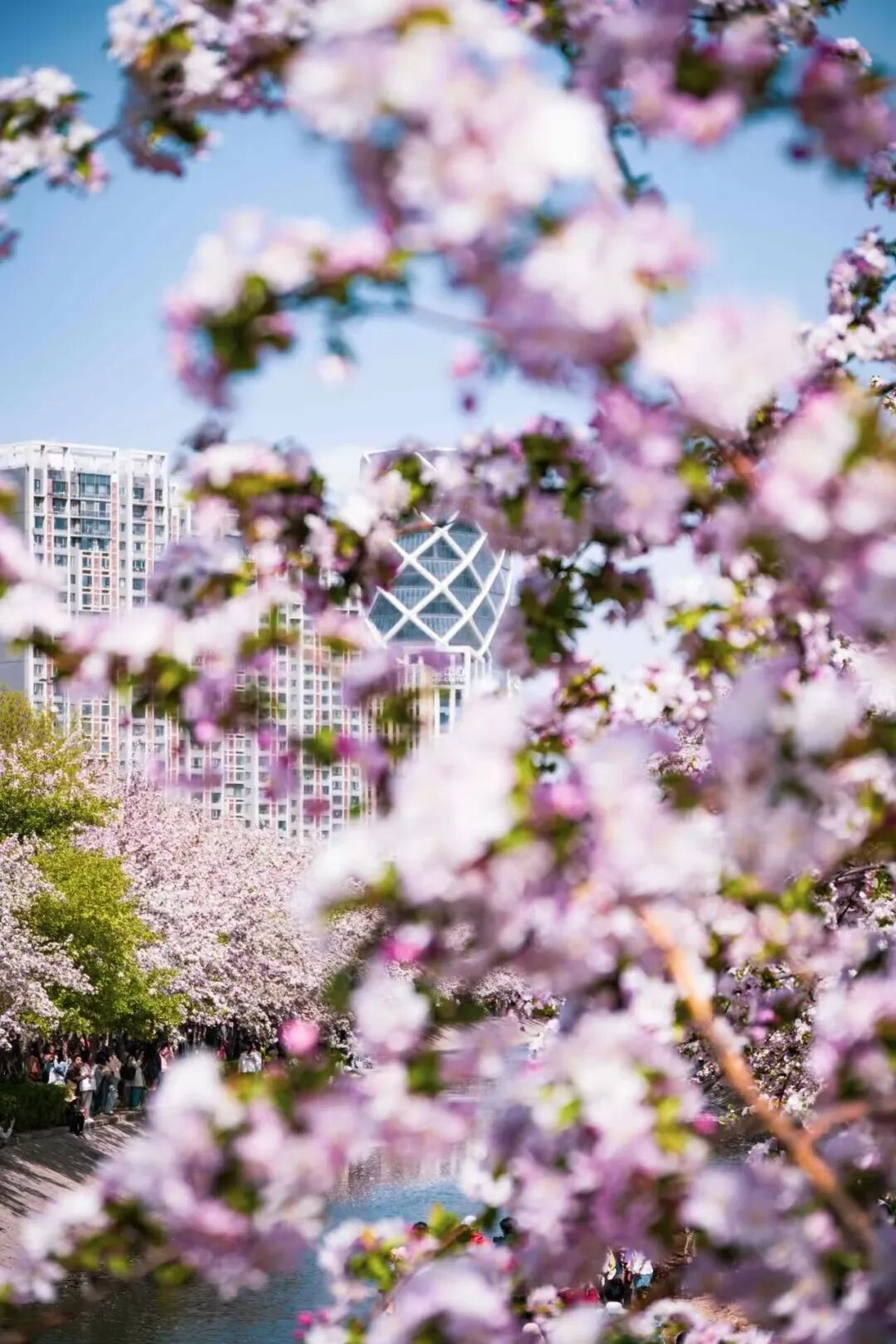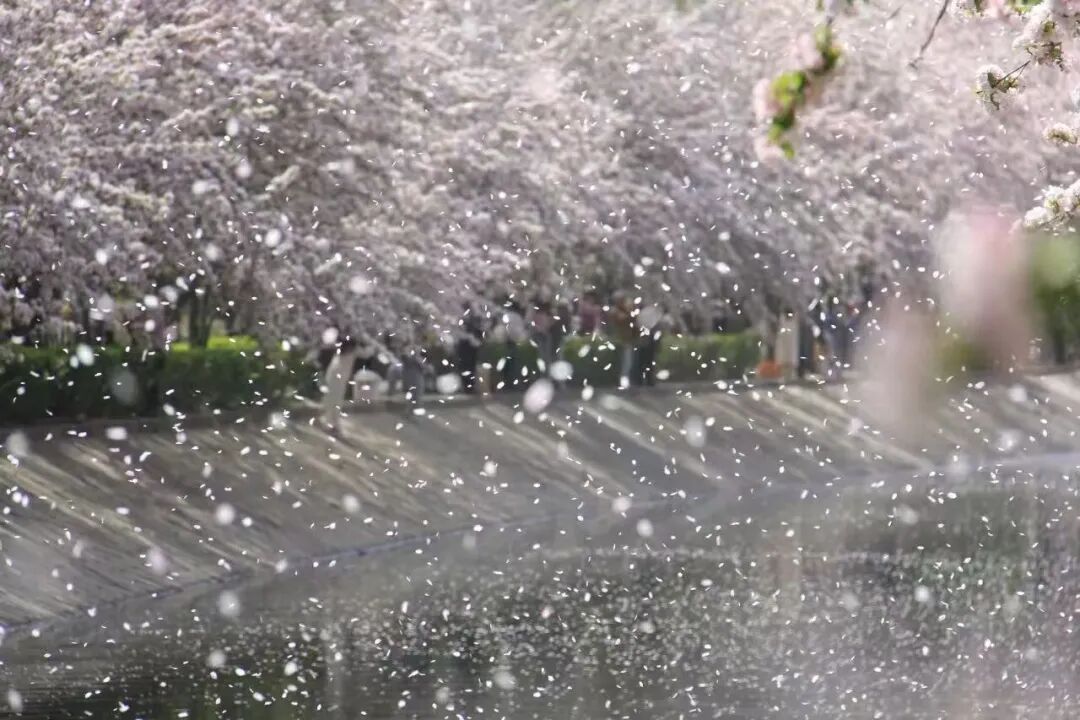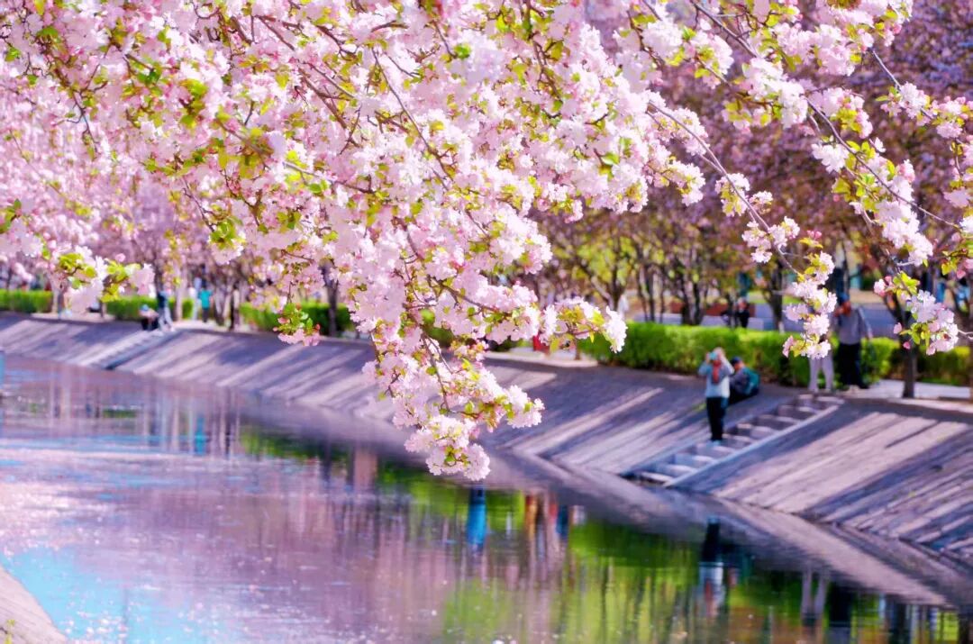漫步花溪之间,仿佛置身粉色海洋。粉白渐变的花瓣,宛若少女娇羞泛红的脸颊,纯净中藏着几分妩媚。微风过处,花朵轻轻颤动,似在低语春日的秘密。花瓣如雪,纷纷扬扬飘落,洒在河面上,如一叶叶粉色小舟,随潺潺流水缓缓前行,最终消失在花溪尽头。阳光透过花瓣洒下,落下斑驳光影,为这场粉色盛宴添了几分梦幻与诗意。游客与居民穿梭花下,或举相机定格美景,或与花瓣“共舞”,脸上都漾着春日的欢喜。这是望京人家门口的美景,是触手可及的春日温柔。