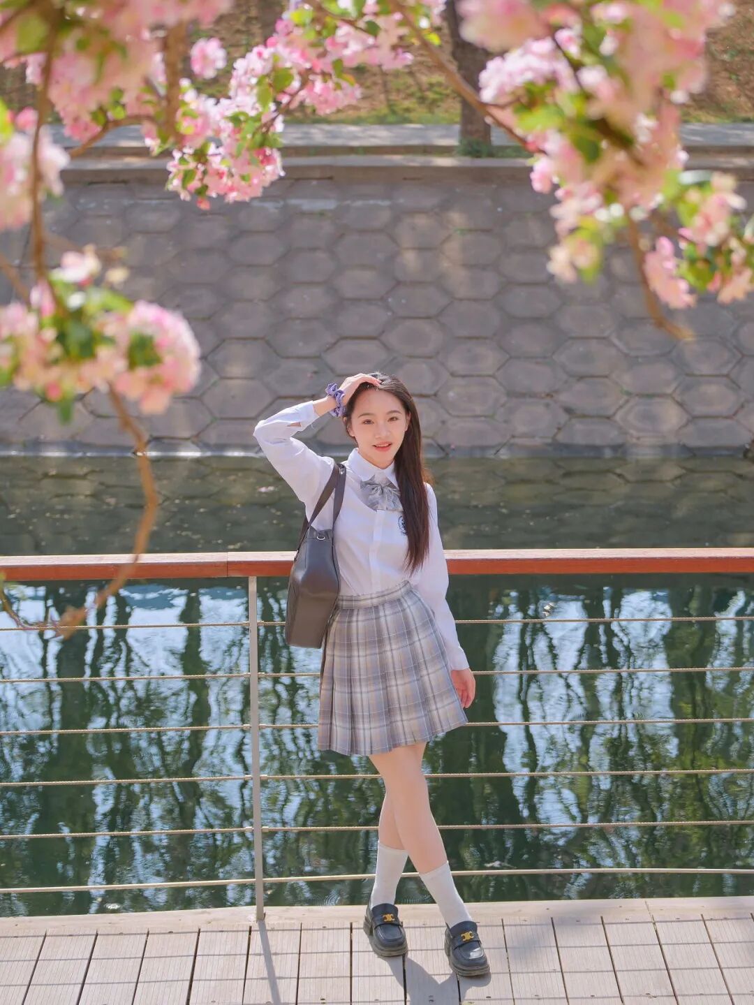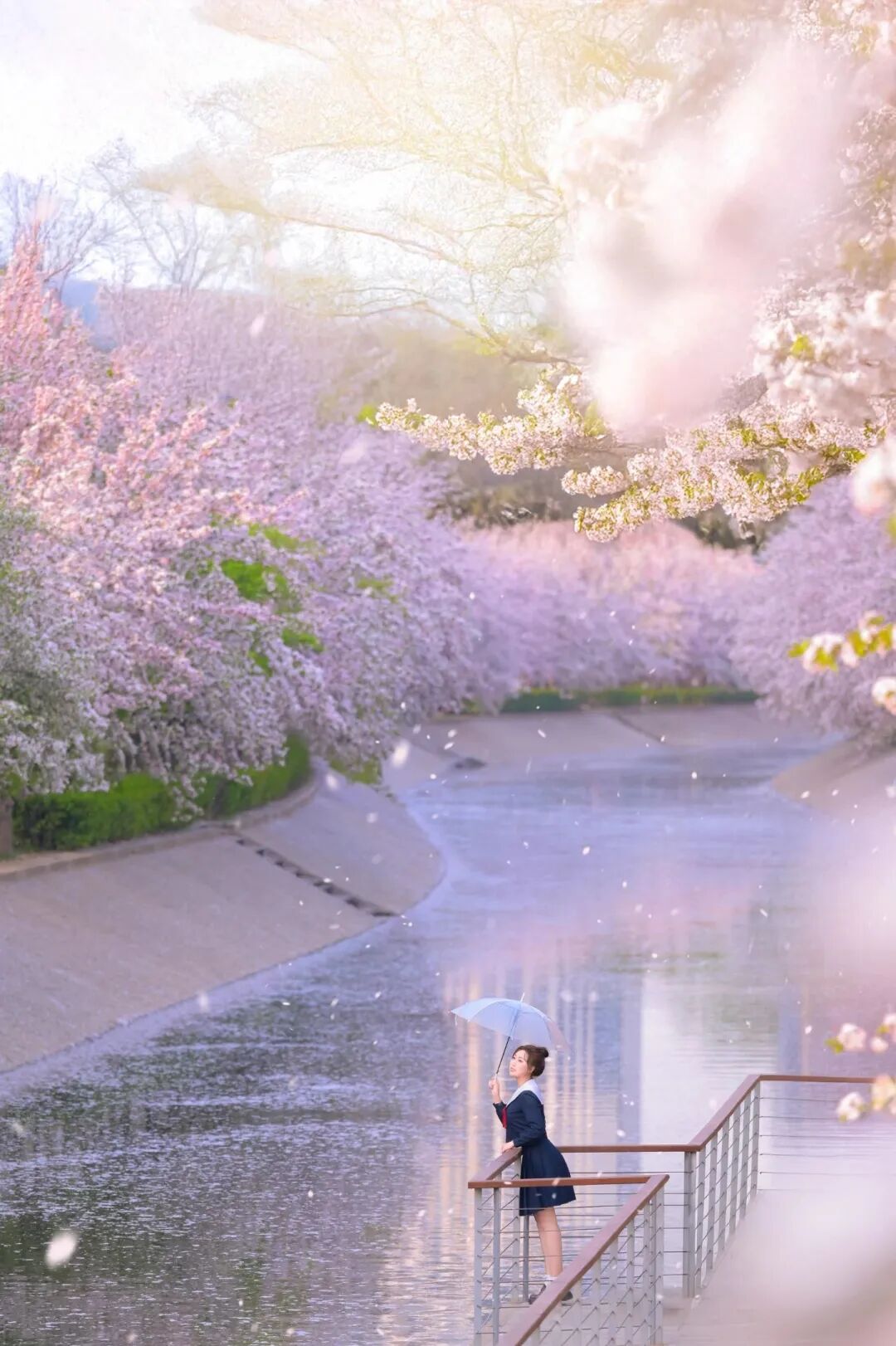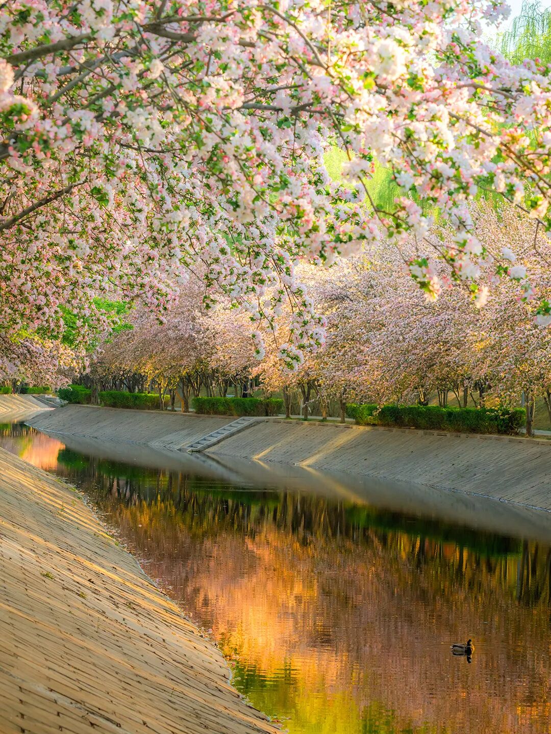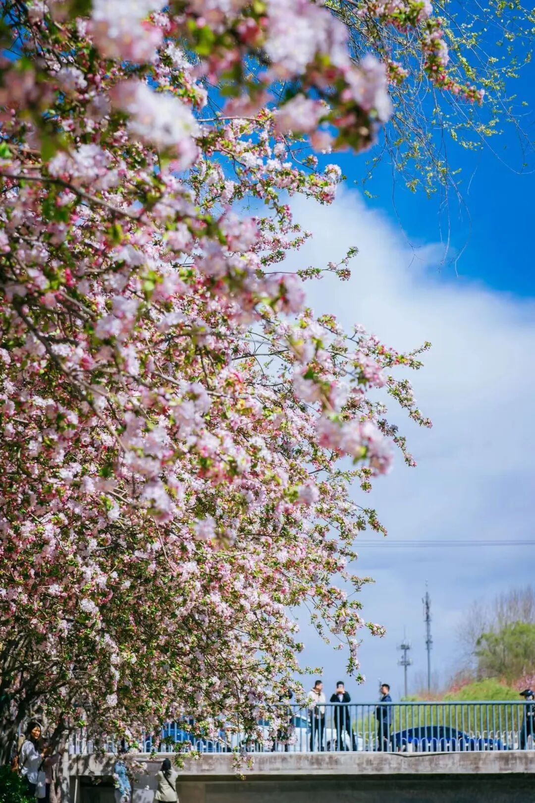 漫步花溪之间,仿佛置身粉色海洋。粉白渐变的花瓣,宛若少女娇羞泛红的脸颊,纯净中藏着几分妩媚。微风过处,花朵轻轻颤动,似在低语春日的秘密。花瓣如雪,纷纷扬扬飘落,洒在河面上,如一叶叶粉色小舟,随潺潺流水缓缓前行,最终消失在花溪尽头。阳光透过花瓣洒下,落下斑驳光影,为这场粉色盛宴添了几分梦幻与诗意。游客与居民穿梭花下,或举相机定格美景,或与花瓣“共舞”,脸上都漾着春日的欢喜。这是望京人家门口的美景,是触手可及的春日温柔。
