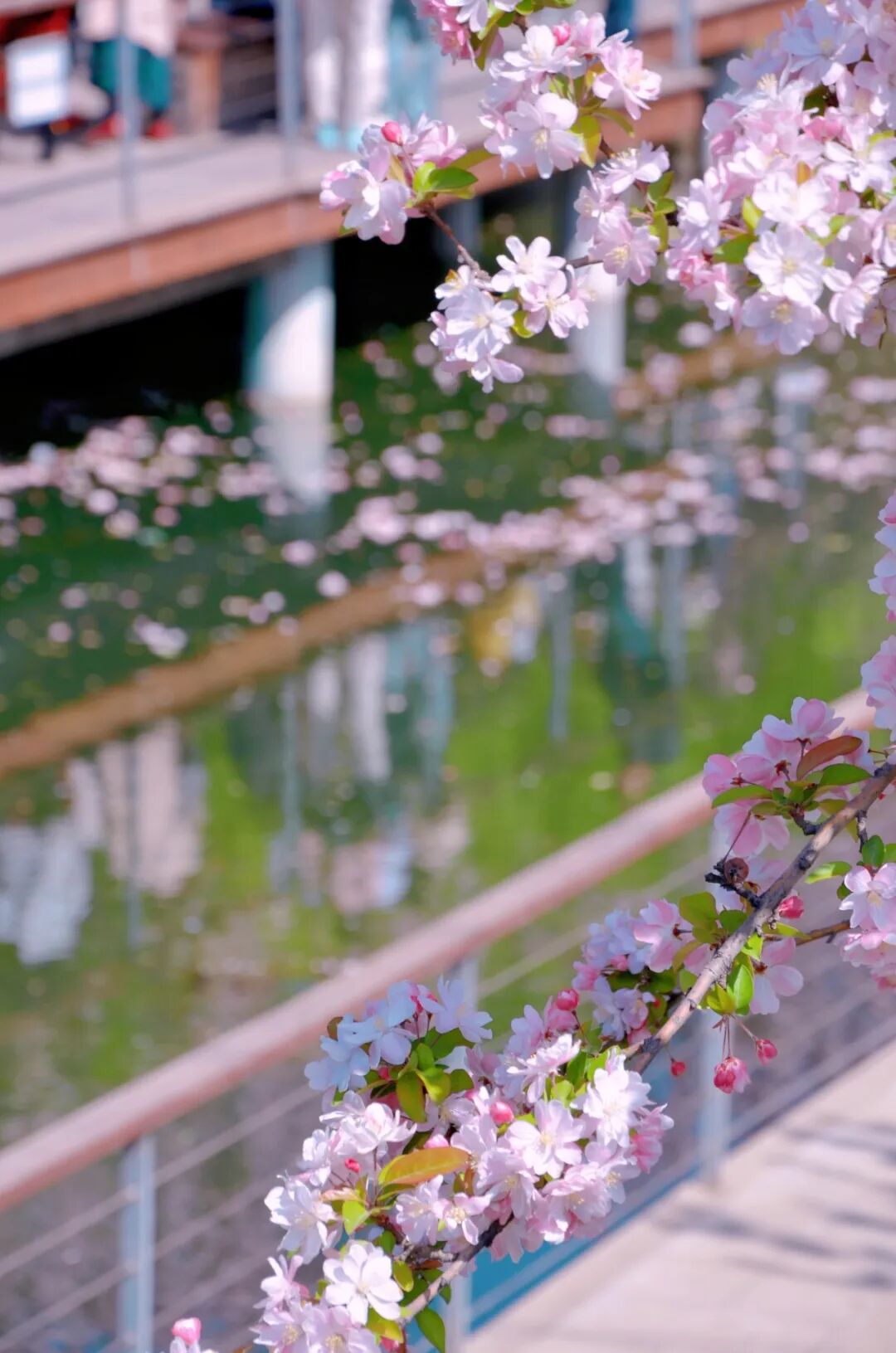 沿着望京河岸前行,一条条木质的临水步道将人们与自然拉得更近。走在临水步道上,海棠花触手可及,花瓣偶尔落在肩头,水波在脚边荡漾,让人仿佛置身于海棠花的怀抱之中。