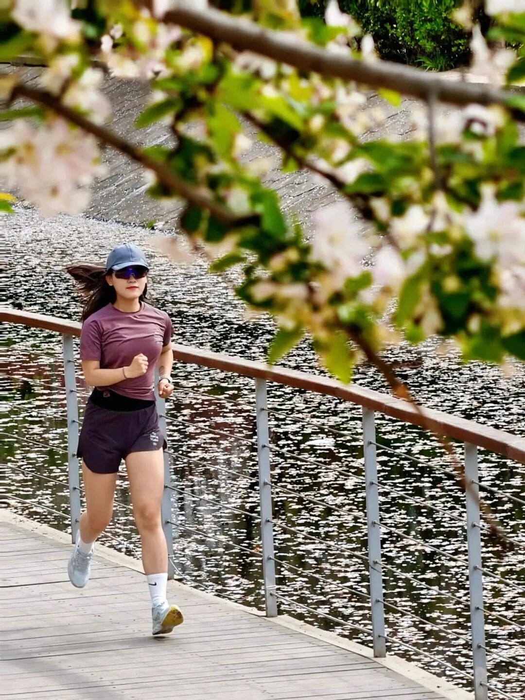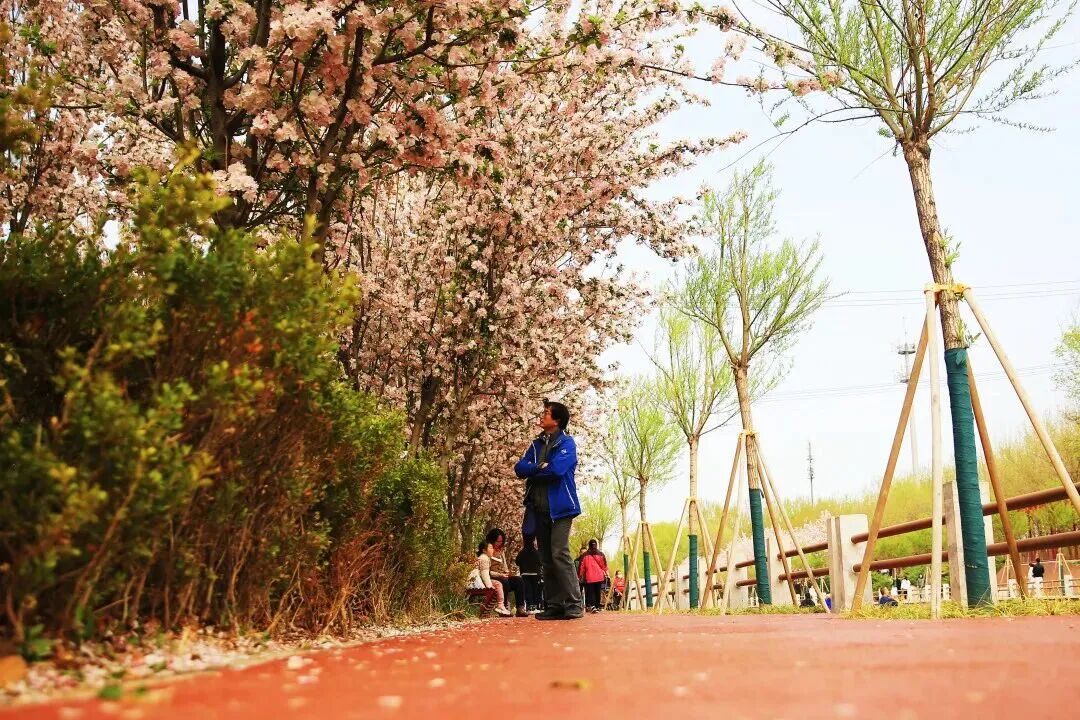 在花海与碧水之间,一条鲜艳的红色健身步道格外醒目。这条步道沿着望京河蜿蜒延伸,与两岸的海棠花相映成趣,成为居动休闲的活力动脉。清晨,阳光洒在步道上,慢跑爱好者们迎着花香奔跑,脚步轻快有力;傍晚,饭后散步的一家人沿着步道缓缓前行,聊着家常,享受着春日的晚风。