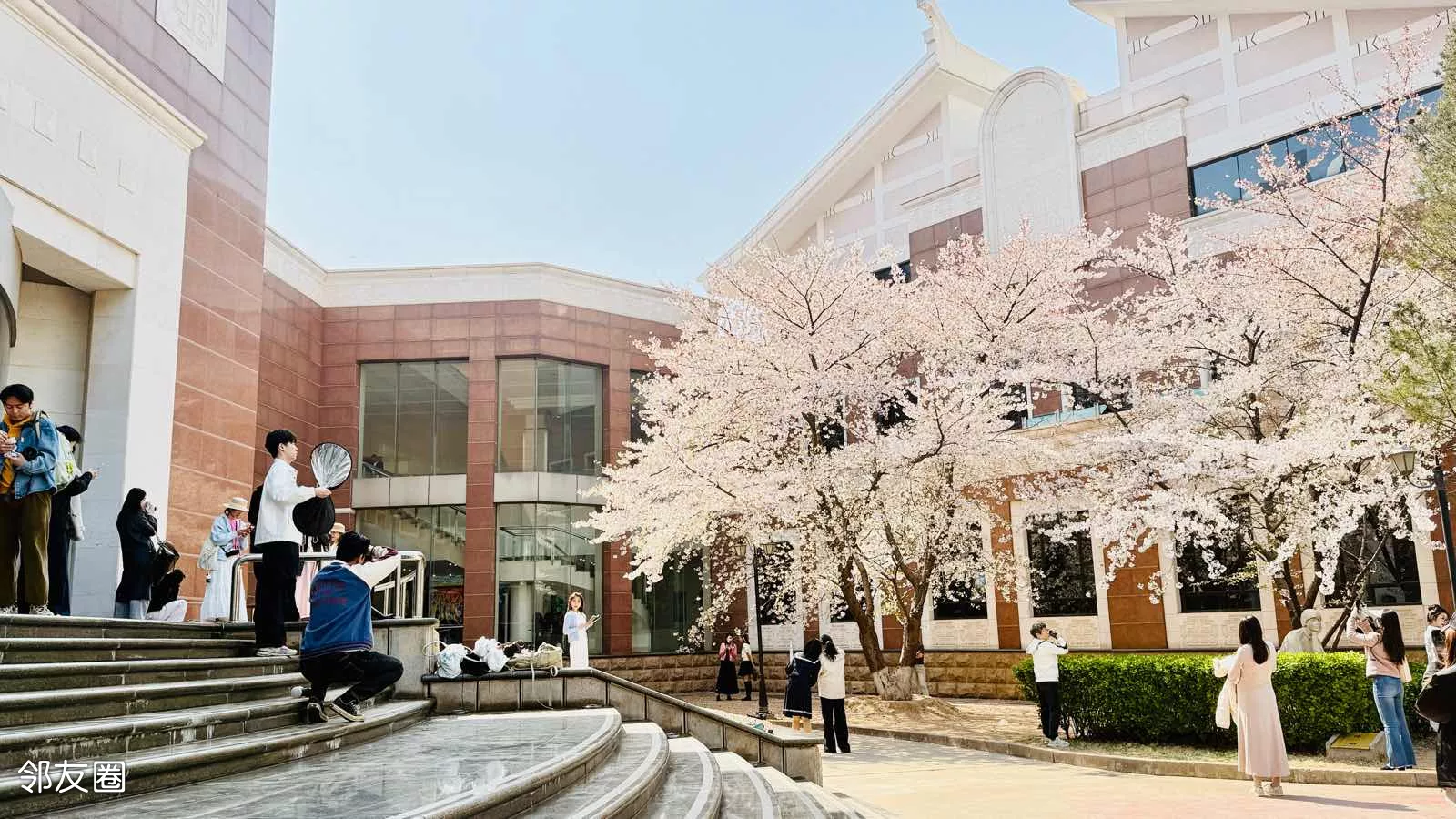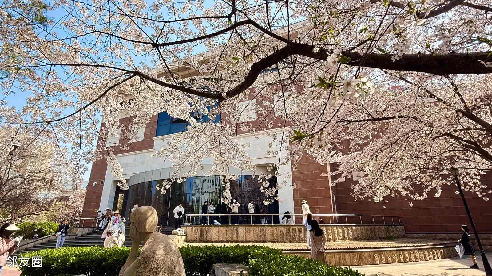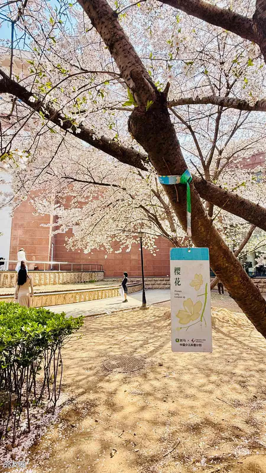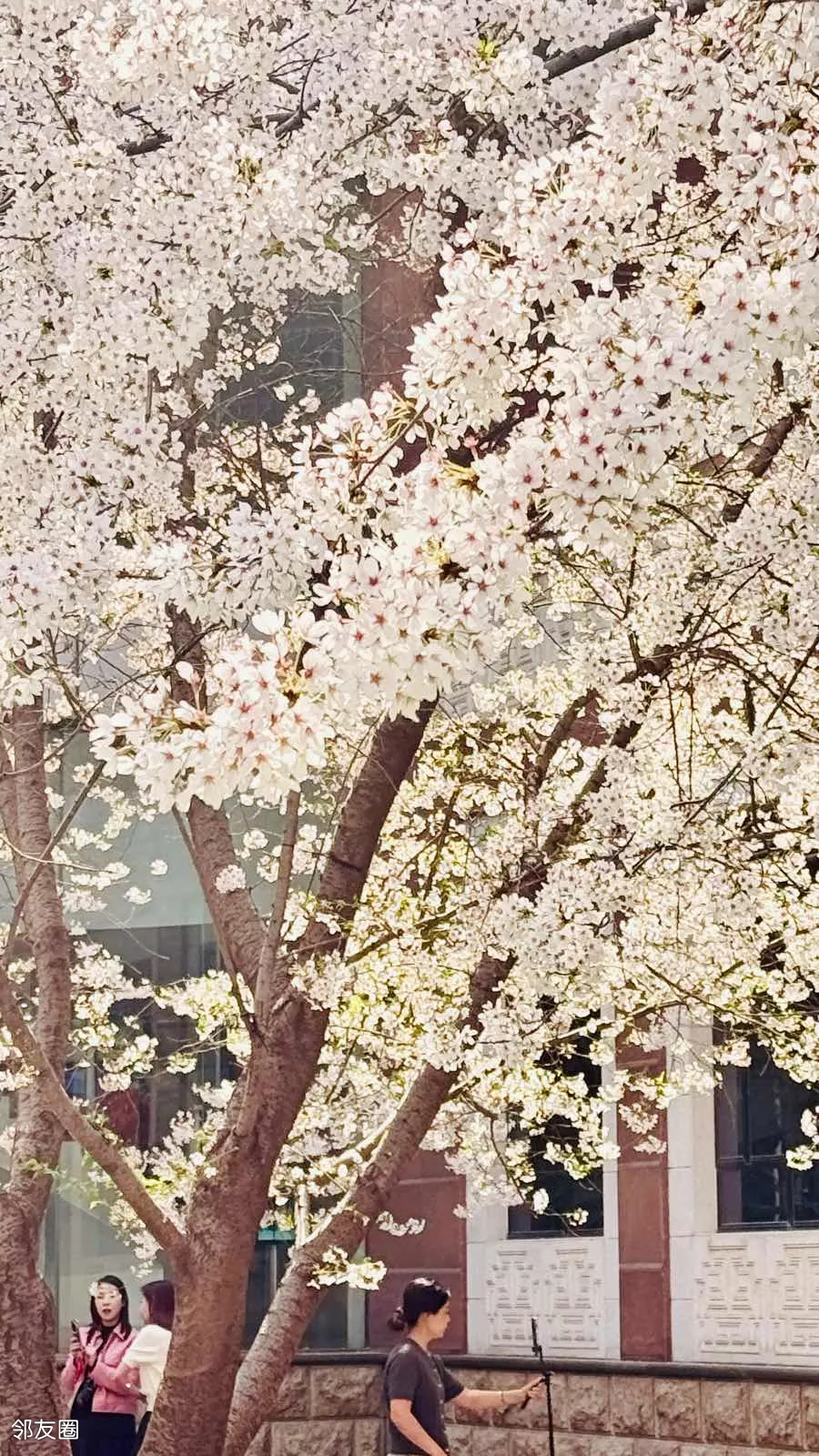 文学馆内的樱花树吸引不少游客抢拍,微风落樱,如雪散花。
