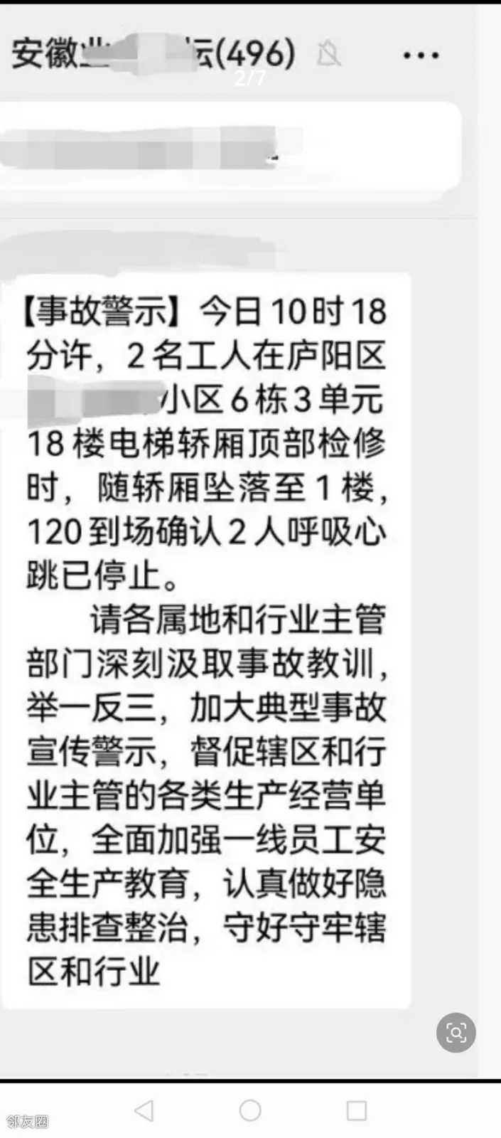 4月2日,一则关于安徽省合肥市庐阳区一小区发生电梯事故的警示提醒在当地多个微信群传播。警示写道,2日上午,庐阳区某小区电梯轿厢坠落,2名检修工人死亡。3日上午,合肥市应急管理局工作人员告诉记者,此事故确有发生,将成立调查组进行调查。