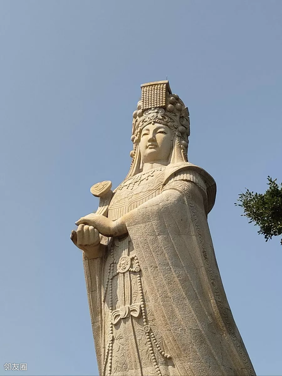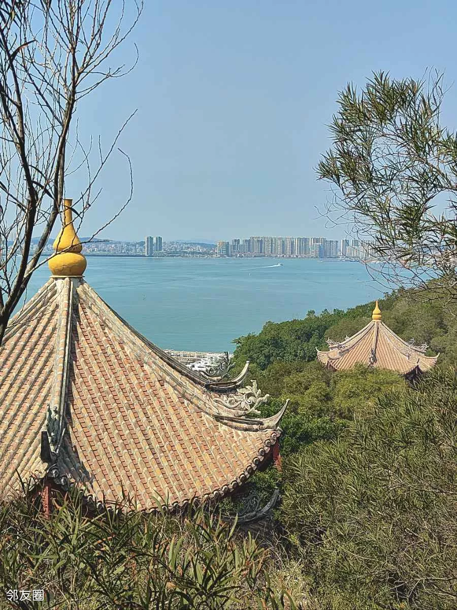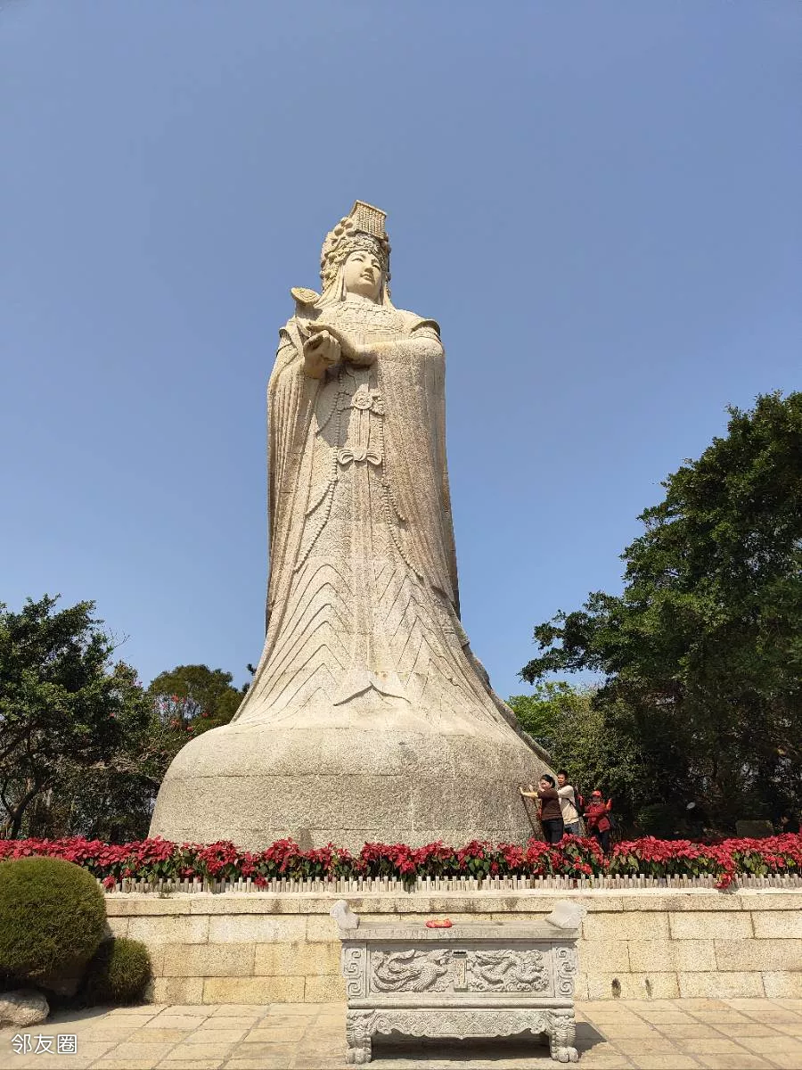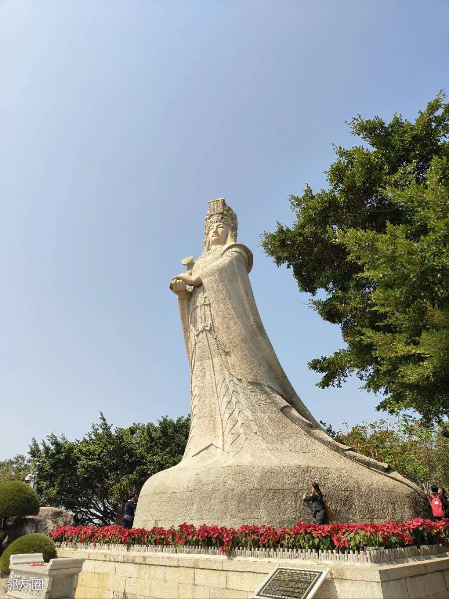 沿着栈道一直往上走,就可以看到高大的妈祖雕像。远处的海景也很美。