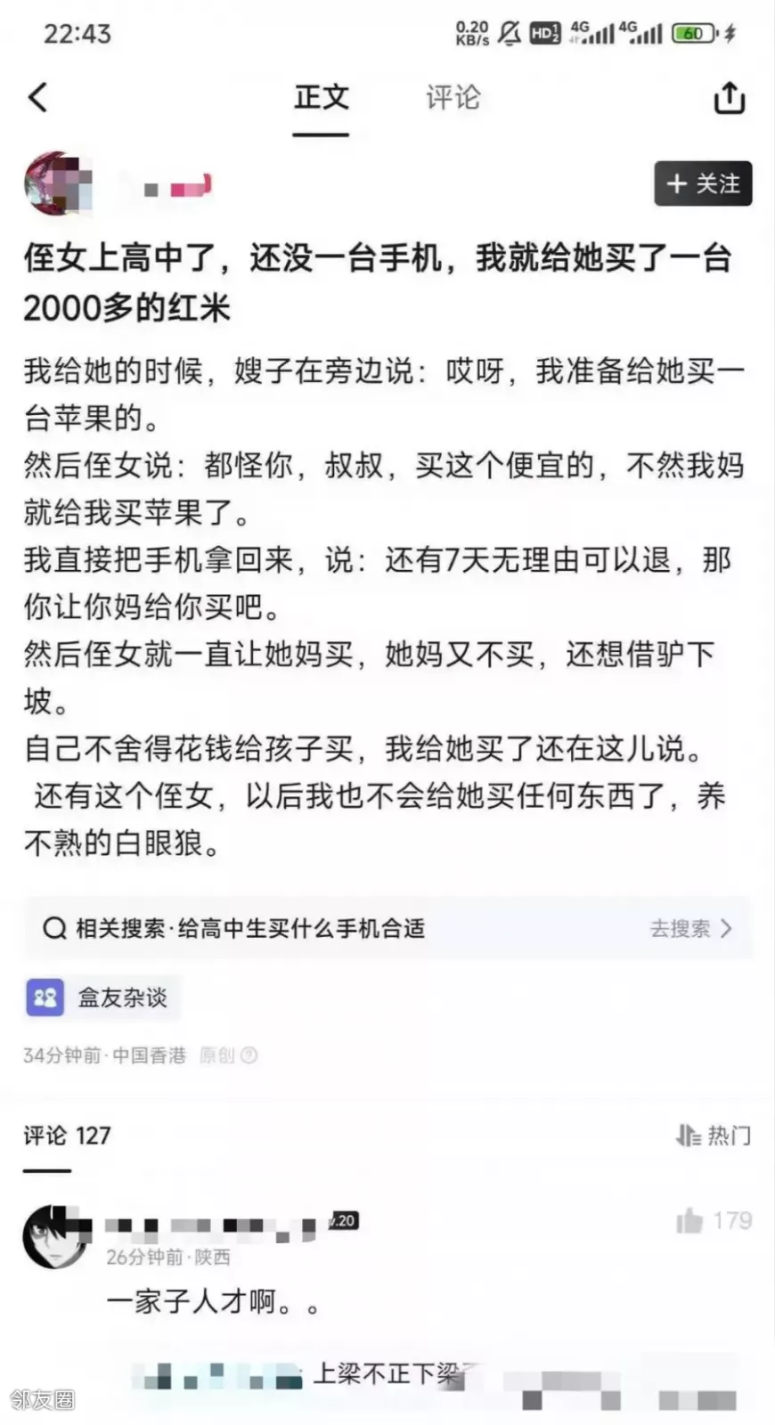 你说到送手机,我给你说说我家奇葩事。我姥姥一个九十多岁的老太太,跟外孙女要手机你敢信?!买了个两千多的手机送去了,遭一屋子人嫌弃。老太太不吭气儿,一边儿的舅舅们呲牙咧嘴尖酸刻薄说啥狗屁手机,也不知道买个苹果手机来,真不孝顺。小时候还让她在这住了几年都吃了白饭了,养不熟。挣恁多钱有啥用,赔钱货都给别人花了,自己开恁好了车啥时候带咱坐坐了?也不让用用车。我表妹急了跟他们一顿吵架,扭脸走了。过两天看见那个手机跑到一个舅舅手里了。 一家子亲戚,借老太太的口去要别人东西吃大户。服不服。