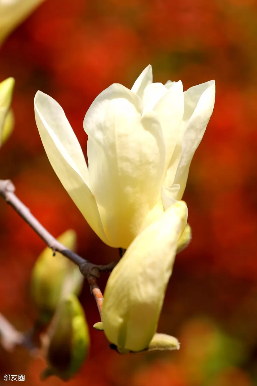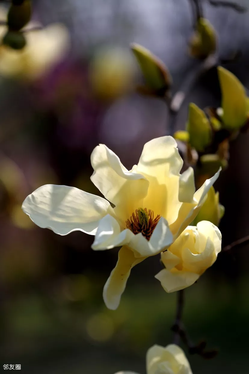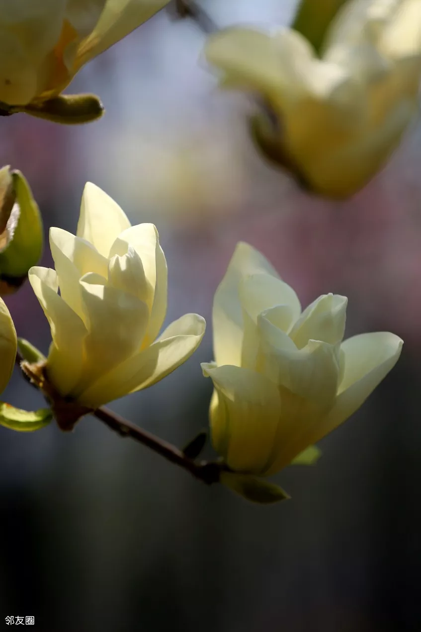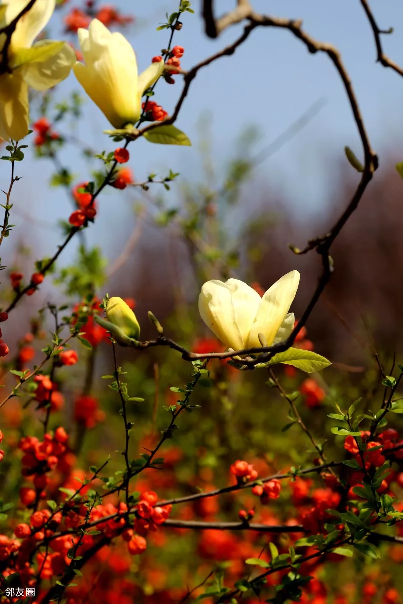 而且,而且这些黄玉兰居然跟贴梗海棠在一起,它俩同框,片子又上了一个档次