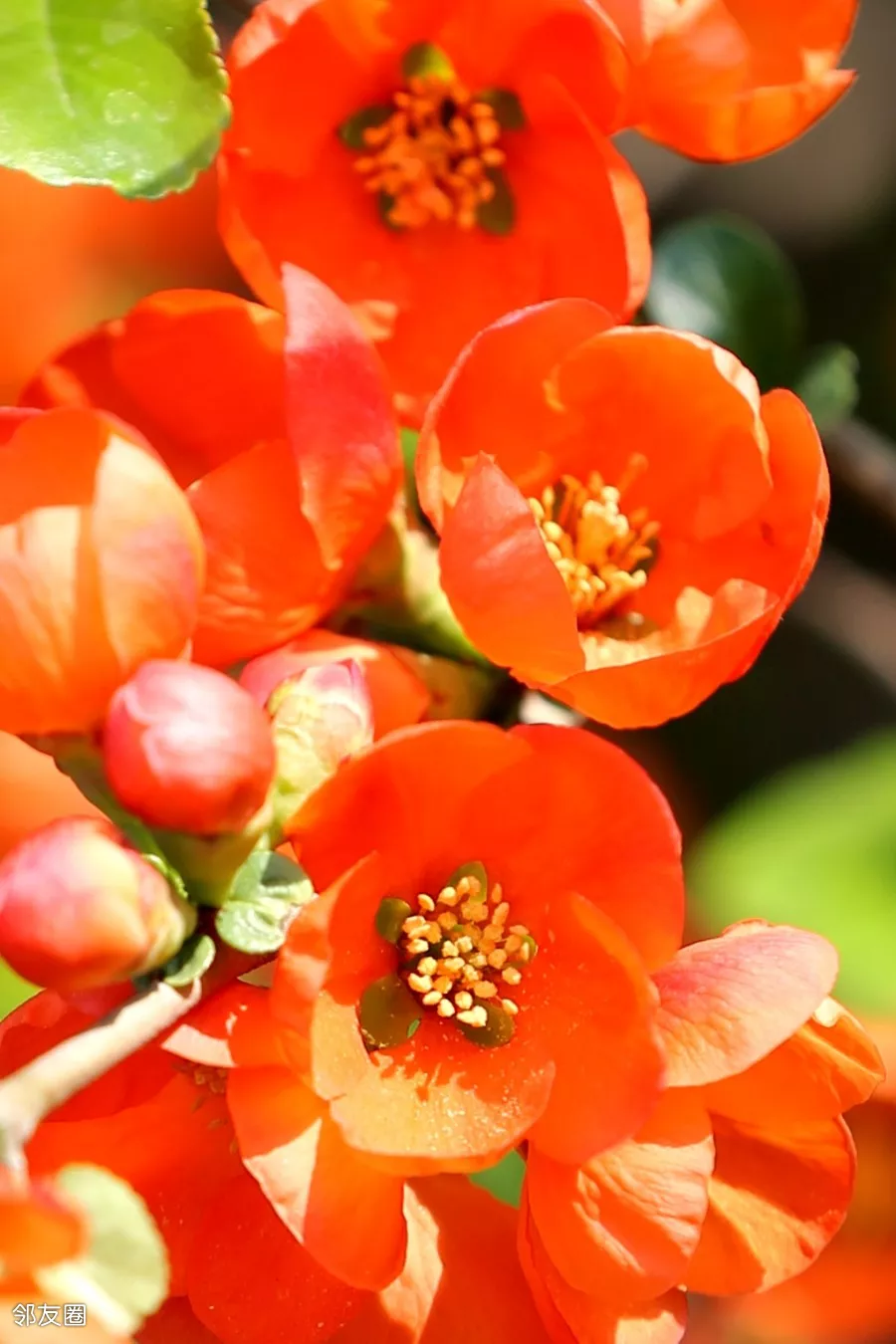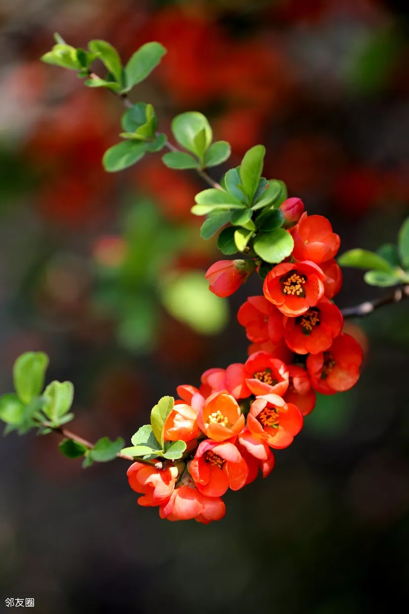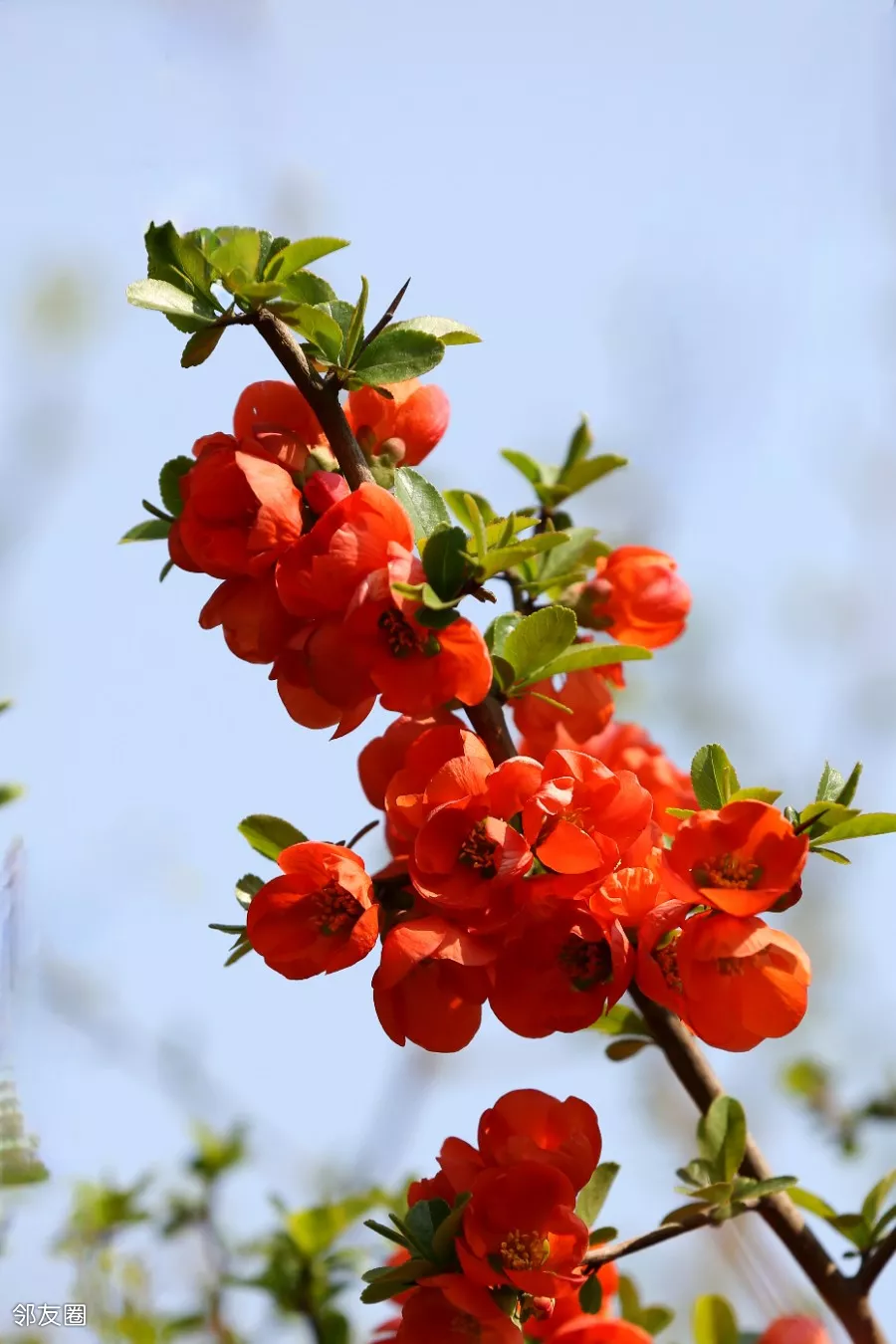 贴梗海棠又叫皱皮木瓜,前一个名儿说的是花,后一个名儿说的是果。单独拍起来也好看,尤其是有蓝天作背景
