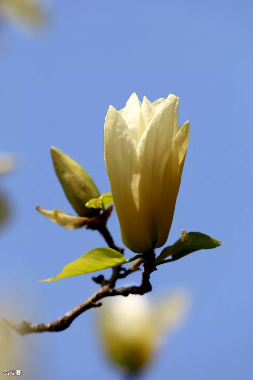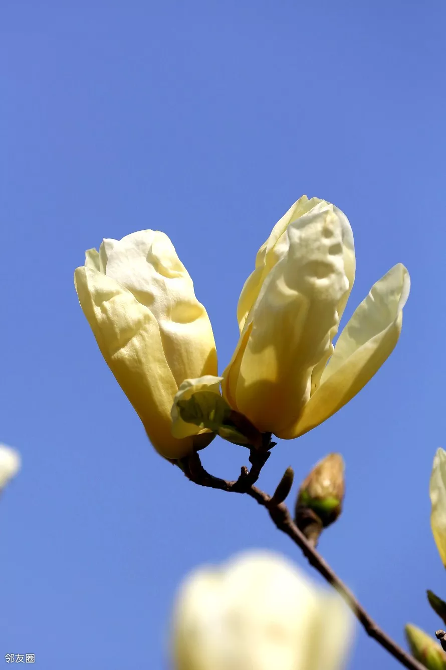 昨天我跑到通州才找到的黄玉兰,在公园里居然有好几棵,我又围着一通拍。拍到了蓝天背景,算是弥补了昨天的遗憾。昨天灰蒙蒙的天太讨厌了