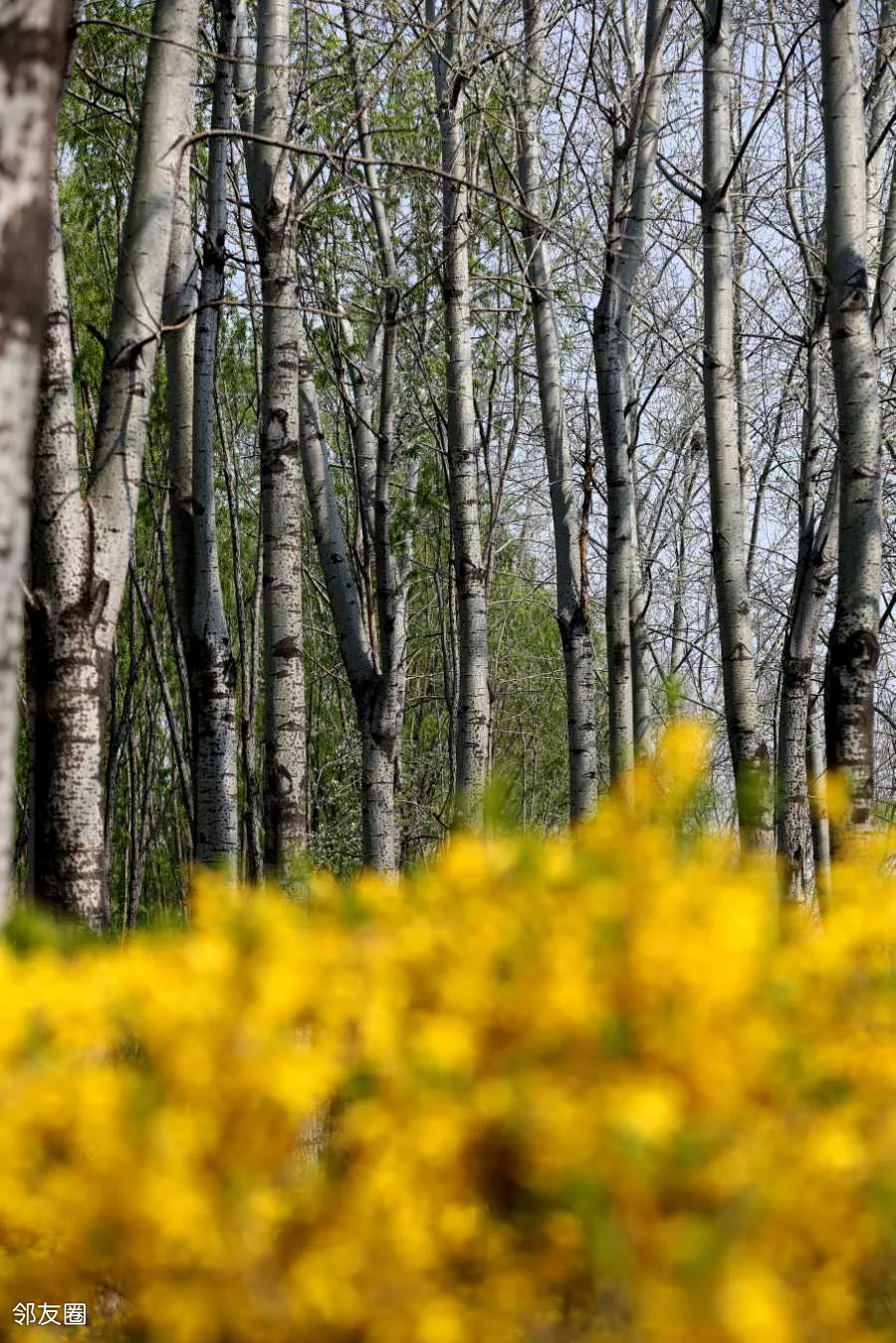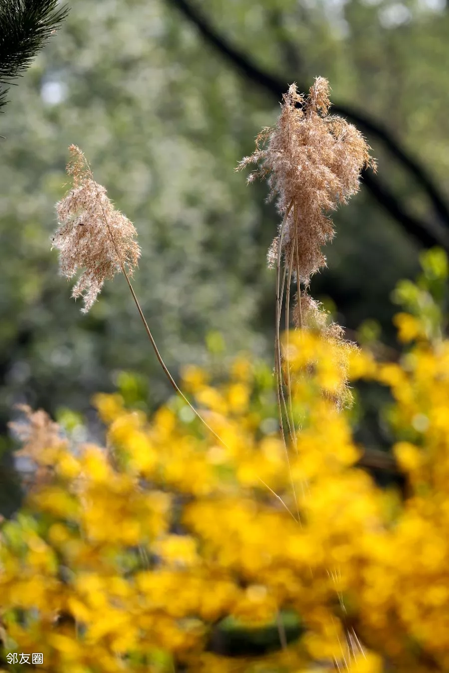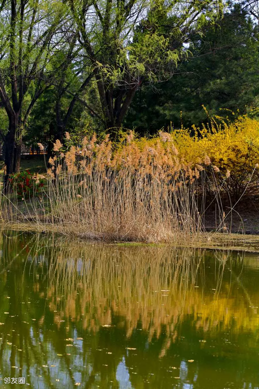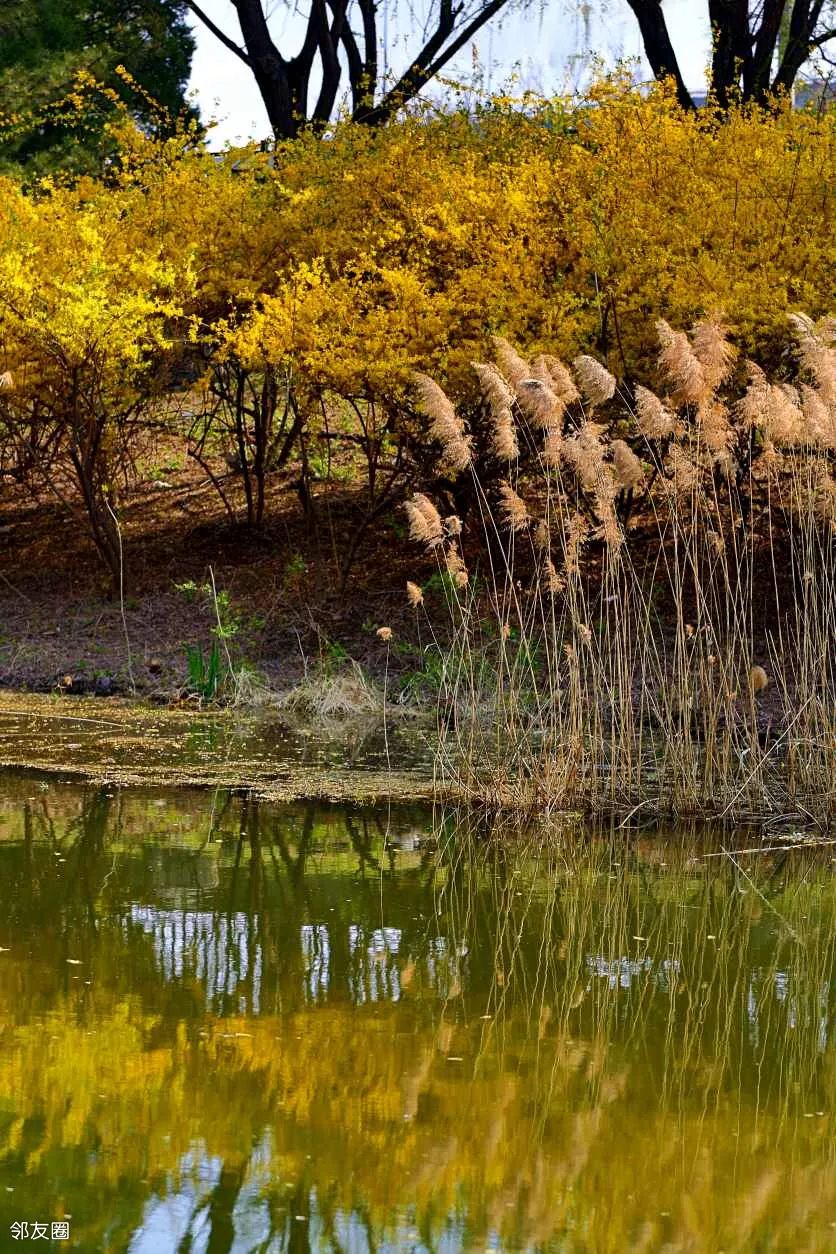 公园的小溪中居然还有未落的芦花,并且等来了春暖花开。连翘一觉醒来,发现秋天开的芦花居然还在,大喜过望。比连翘更大喜过望的是我,因为我又收获了一张美图