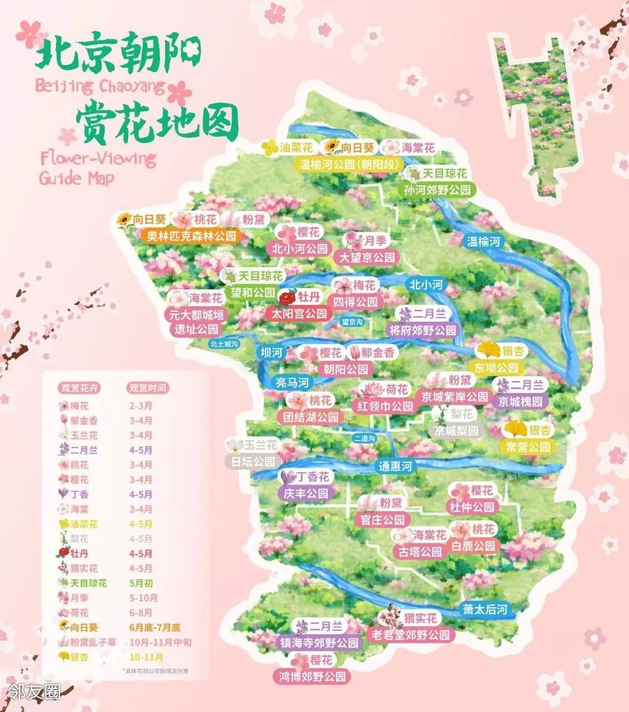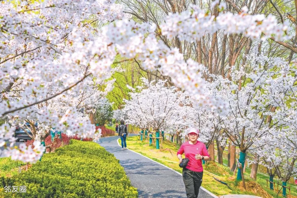 作为朝阳区打造的北京首条“樱花河流”,该景观带覆盖了北小河及沿岸、北小河公园、大望京公园、望和公园,全长4.2公里。市民从北小河公园东门出发,沿滨水绿道一路东行,沿途可赏阳光樱、江户樱、飞寒樱等樱花,花色从粉红、浅粉到绯红、粉白、浅黄绿次第变换,花期从3月下旬一直延续至4月底。
