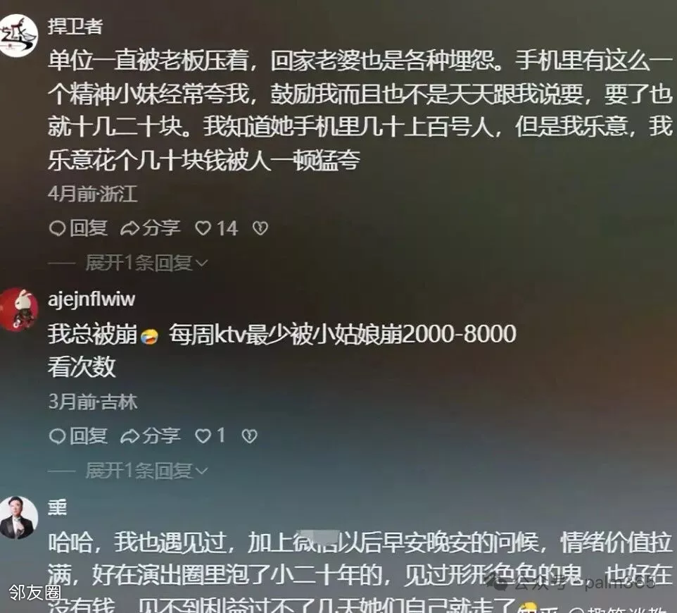 一些年轻女孩用撒娇、陪伴、暧昧、伪装依恋,去换取中年男性的小额赠予:奶茶钱、红包、礼物、吃喝玩乐、日常开销。她们嘴甜、会共情、懂示弱,一口一个 “叔叔”“哥哥”,精准击中对方内心的空虚与被需要感;却从不动真情,不建立真实关系,不深度投入,只维持一种浅层次、可随时抽身的 “假性亲密”。金额不大,频次密集,广撒网、多线操作,积少成多,便成了一条看似轻松、无需技能、不用吃苦的来钱路径。