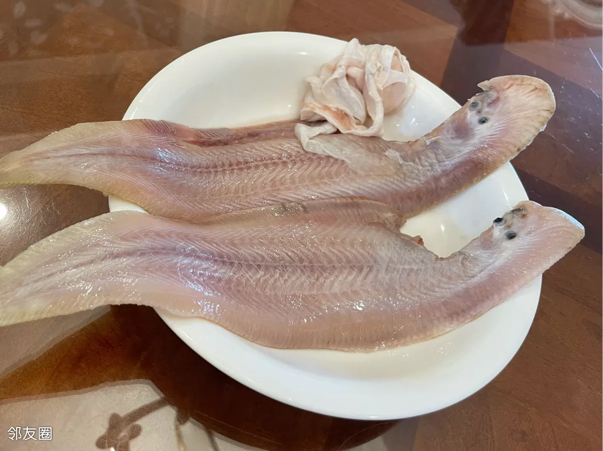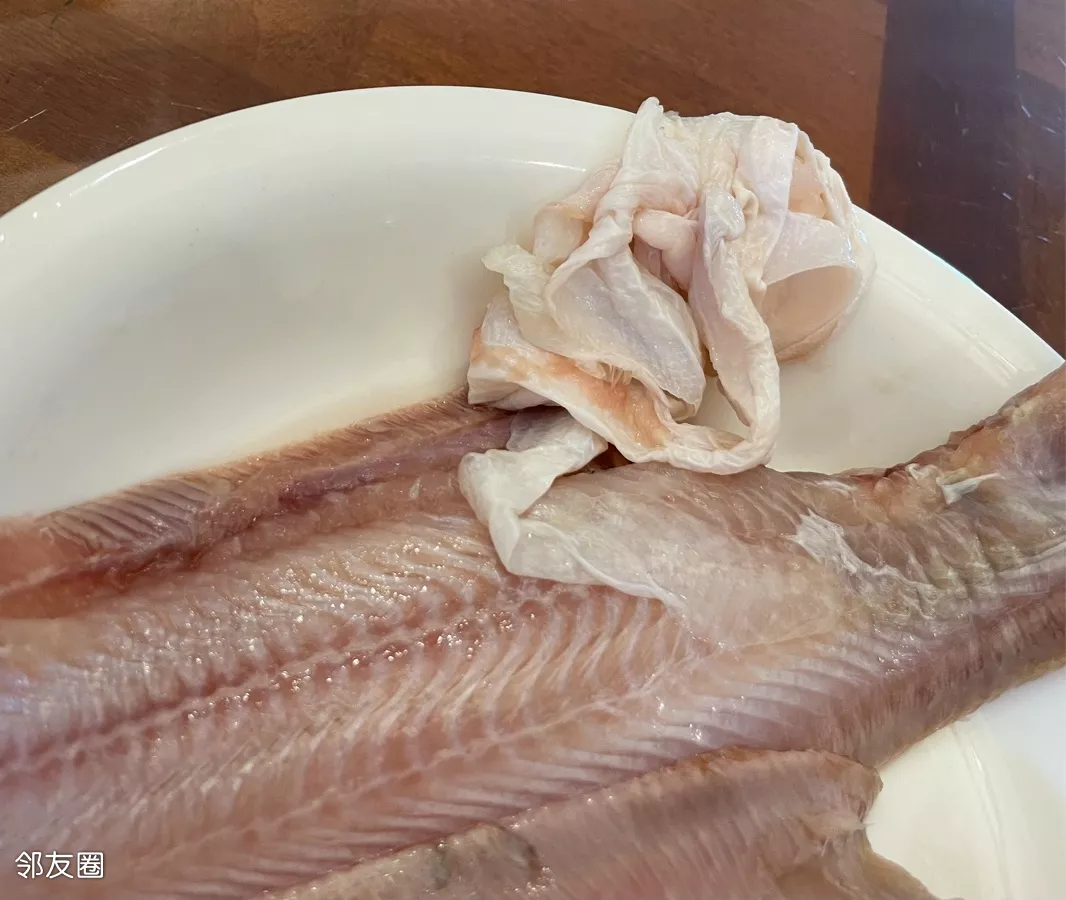 这是剥下来的鱼皮~鳎目香飘一厨房,鱼皮难剥愁断肠……鳎目鱼必须剥皮吃,这种鱼的皮特别腥,剥皮后的净鱼肉就是人间美味了,极鲜美,就是剥皮时需要一定的技巧……