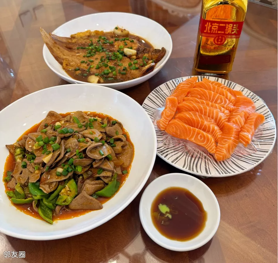 热油爆香的青椒与猪肝,是人间最踏实的烟火气;红烧塔嘛鱼在酱汁里沉眠,每一口都浸着慢炖的温柔;冰鲜的“厚切”三文鱼带着海的清冽,与杯里二锅头的烈,在舌尖撞出一场温柔的醉。热菜暖肠,冷鲜解腻,烈酒助兴,这一桌寻常家宴,便是生活最动人的模样。