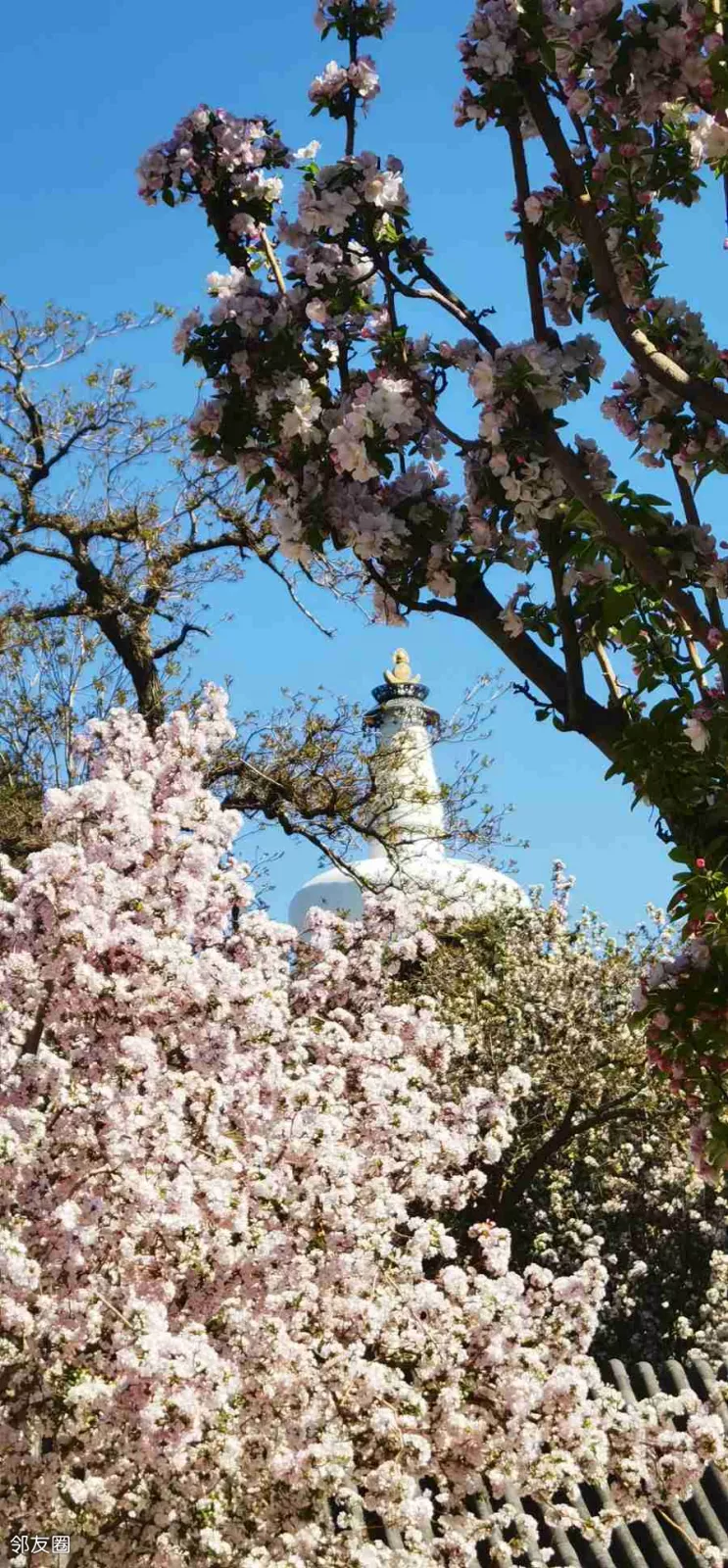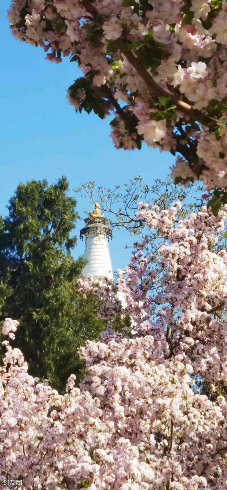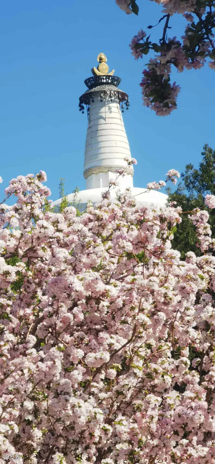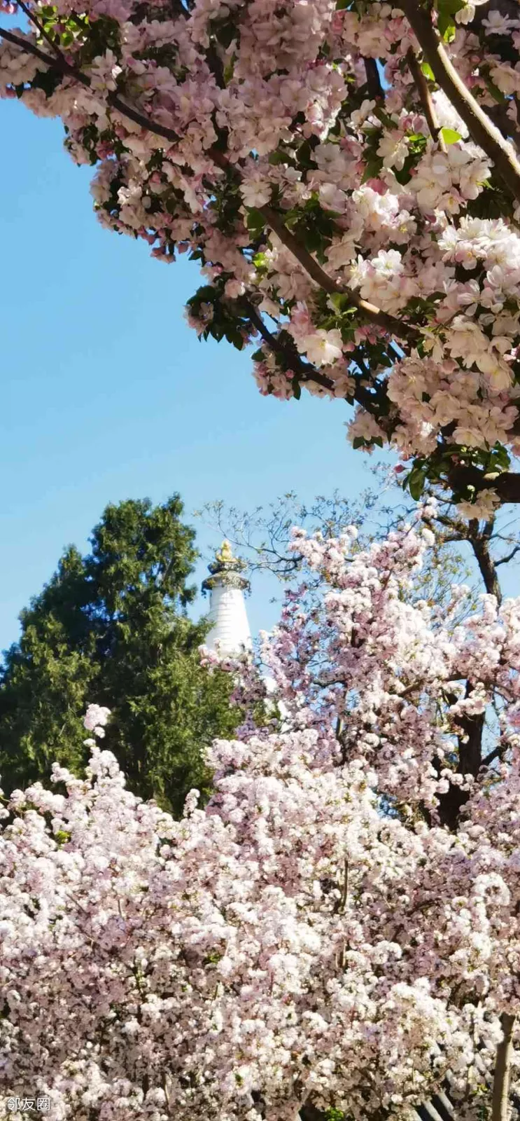 #醉美春天 被粉嫩色浓密的海棠装扮包裹的蓝天下的白塔