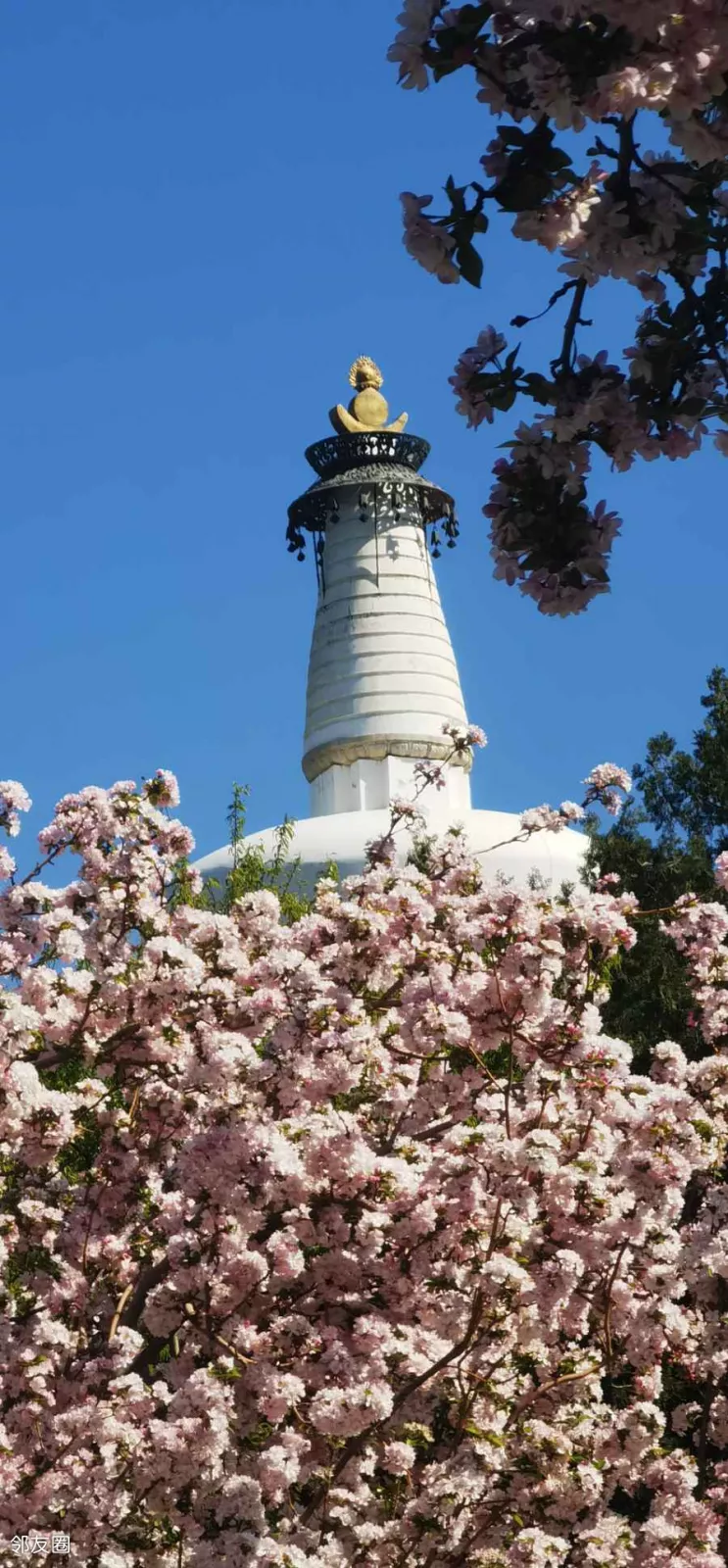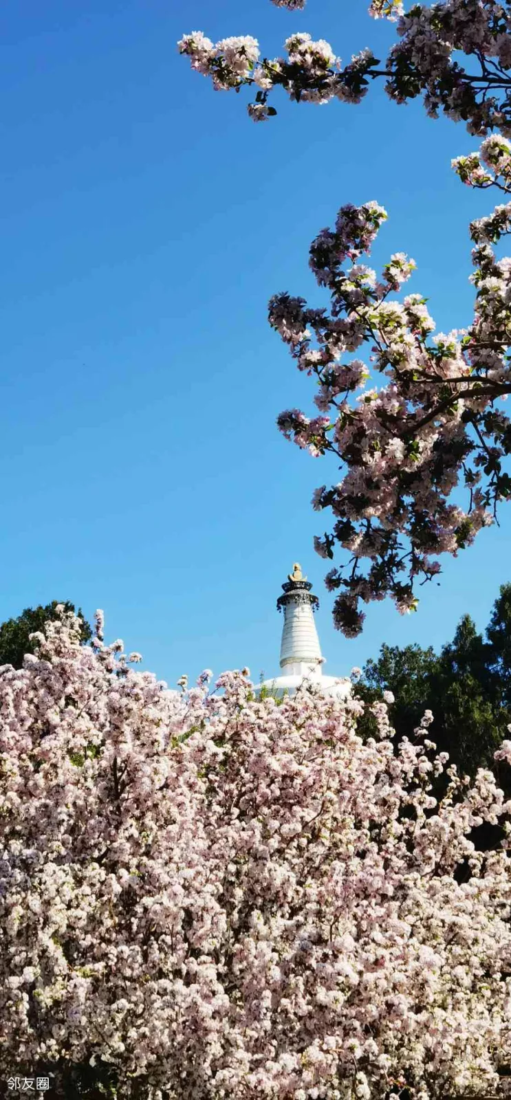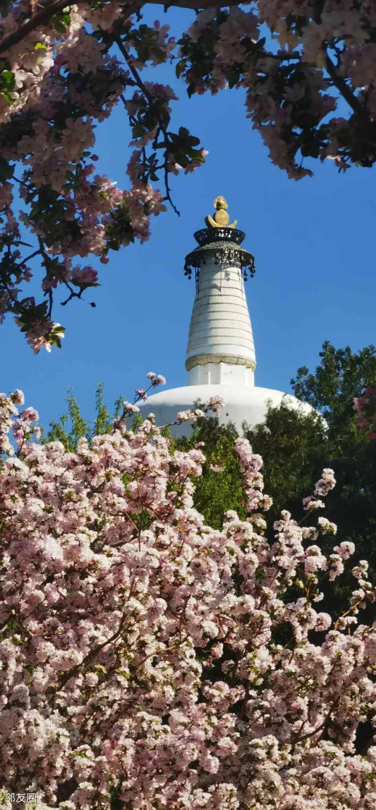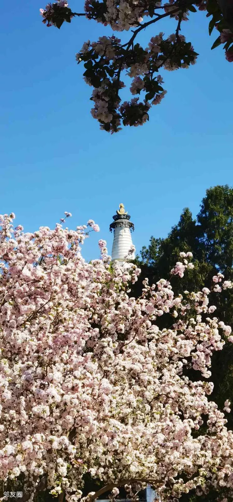 #醉美春天 被粉嫩色浓密的海棠装扮包裹的蓝天下的白塔