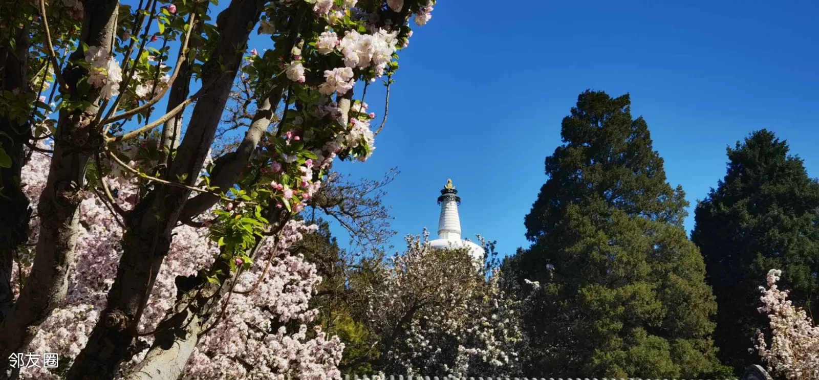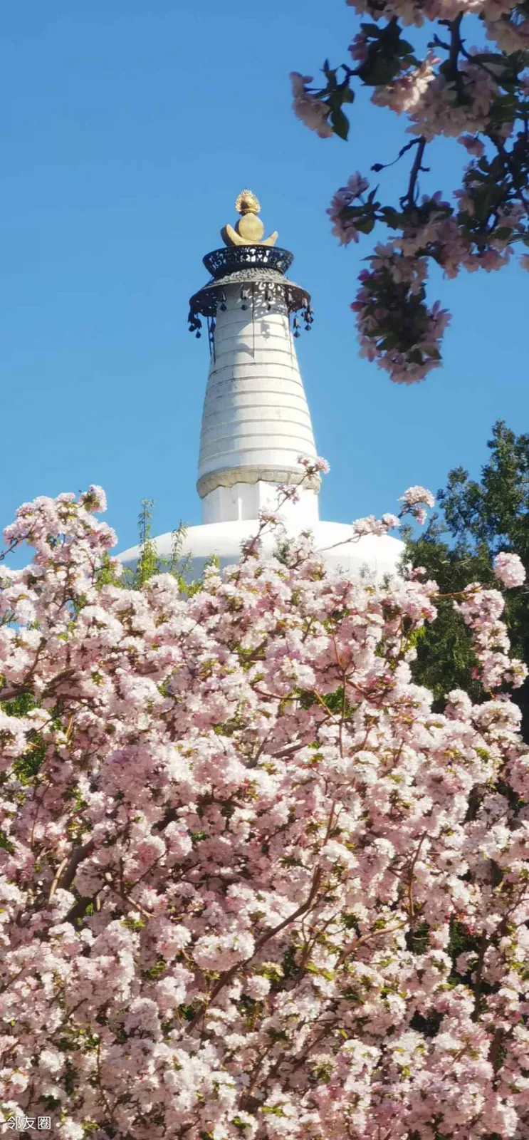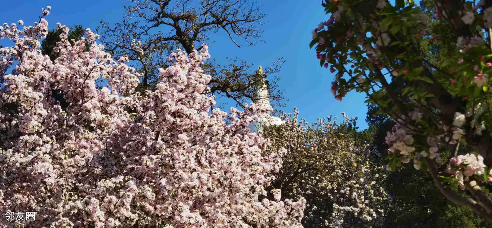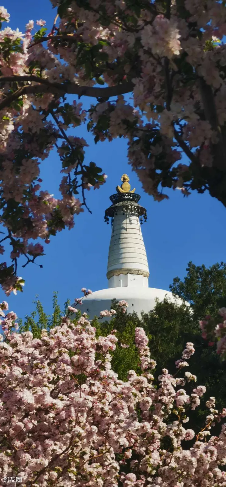 #醉美春天 被粉嫩色浓密的海棠装扮包裹的蓝天下的白塔