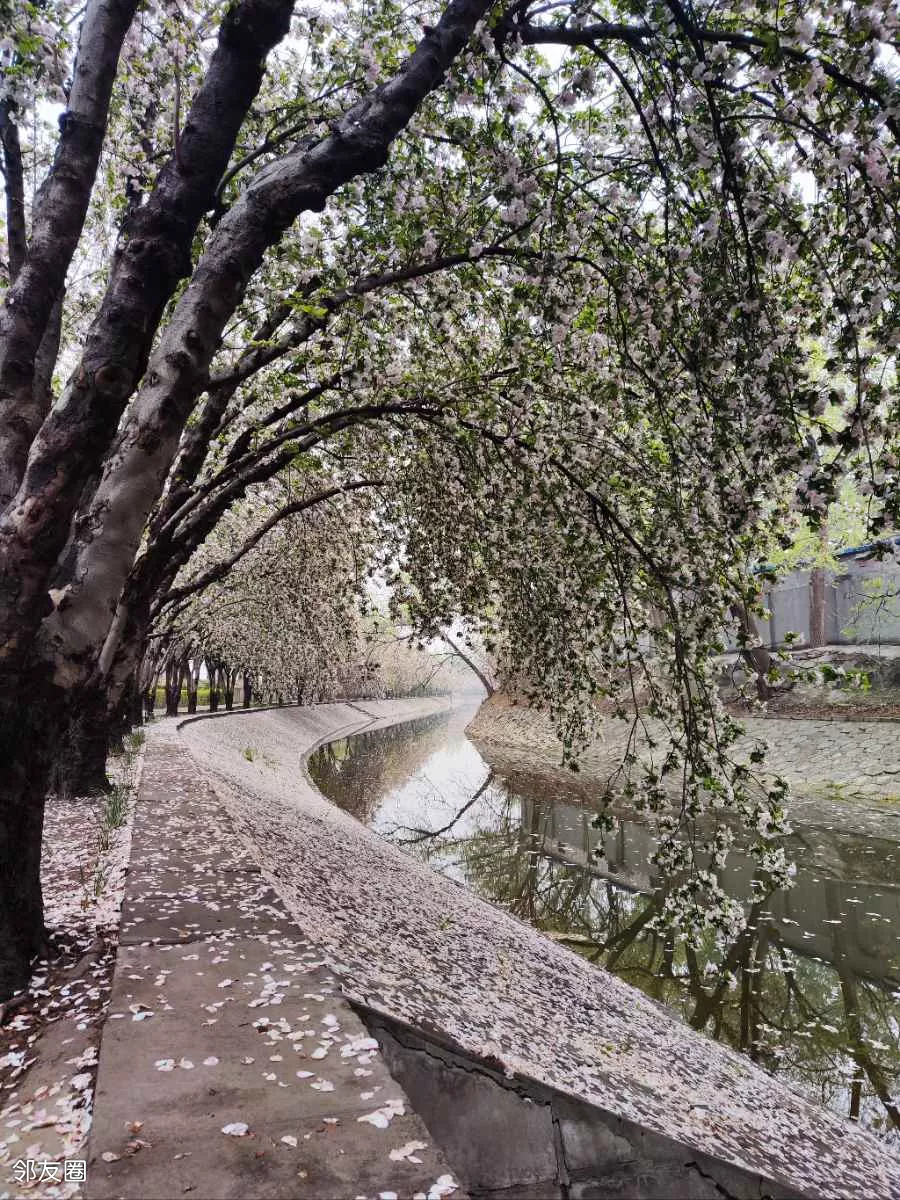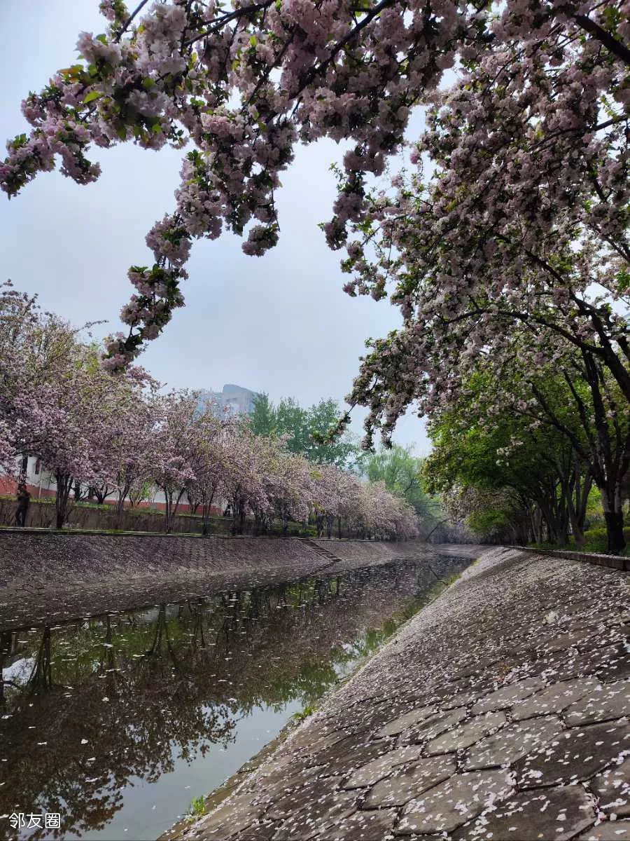 #第三届望京海棠花溪摄影大赛珍爱河道,美好家园!2026年4月8日,望京海棠花溪,工人在清理河道水面上的海棠花瓣及杂物,让花溪更清洁美好。刘宪国摄!(13120
