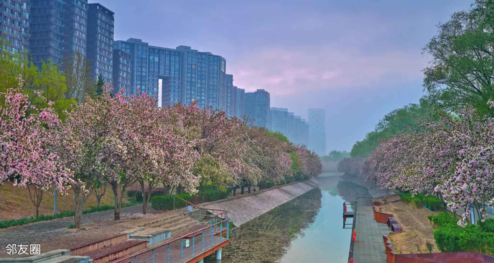 #第三届望京海棠花溪摄影大赛珍爱河道,美好家园!2026年4月8日,望京海棠花溪,工人在清理河道水面上的海棠花瓣及杂物,让花溪更清洁美好。刘宪国摄!(13120