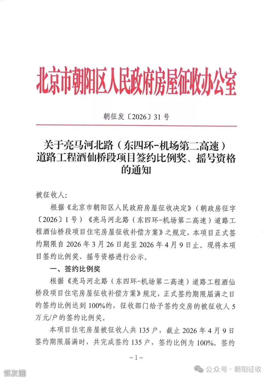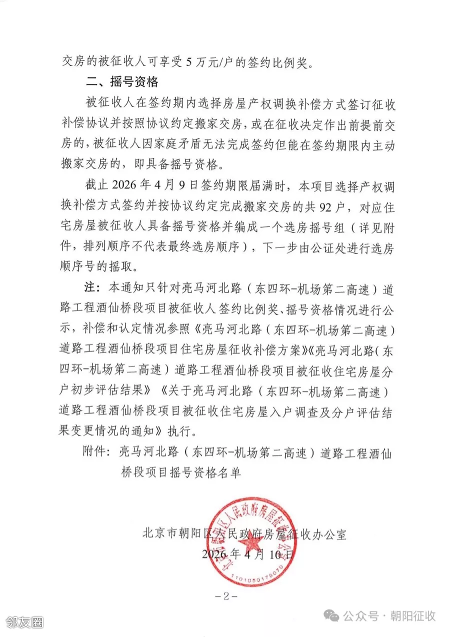 关于亮马河北路(东四环-机场第二高速)道路工程酒仙桥段项目签约比例奖、摇号资格的通知
