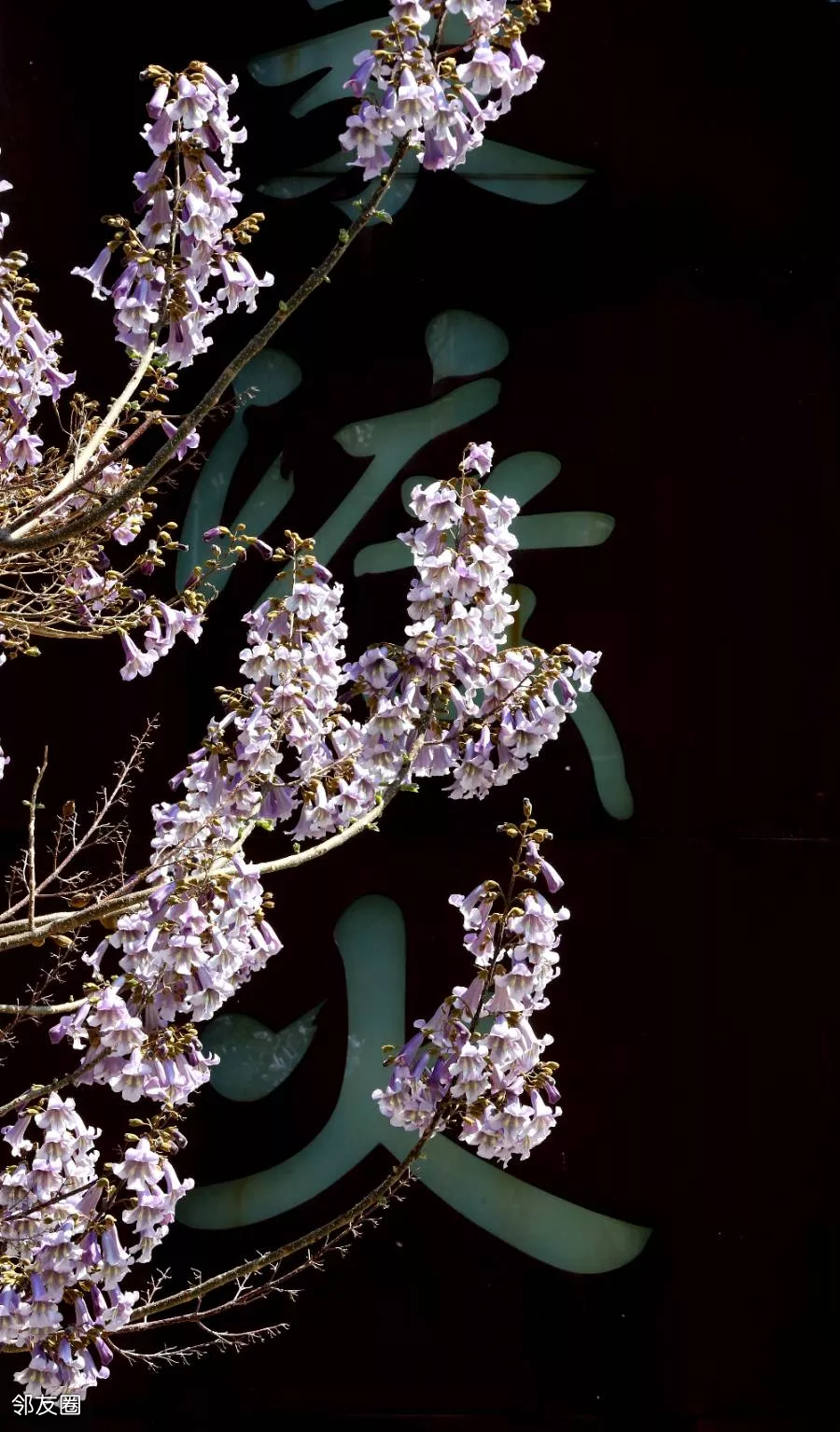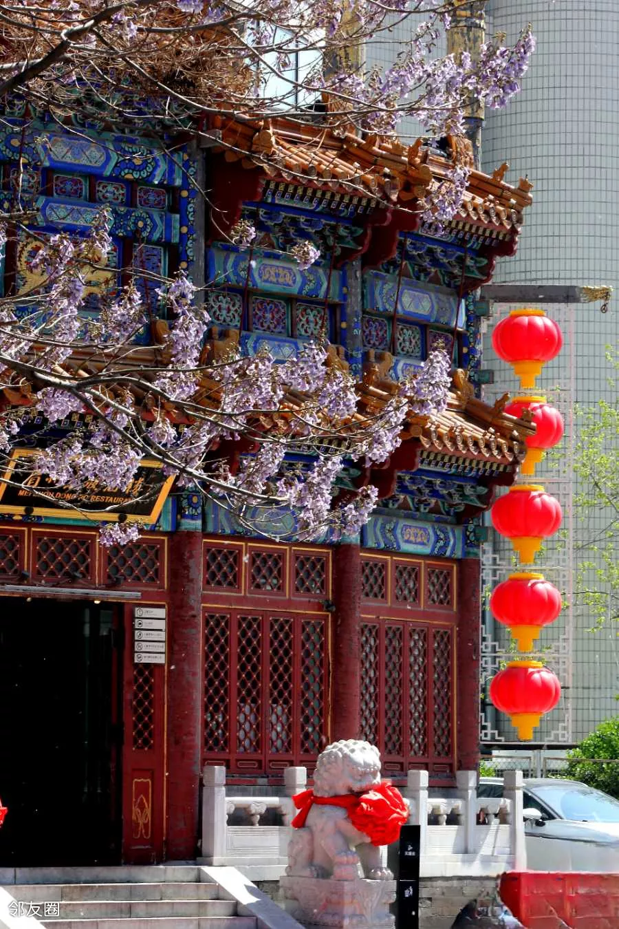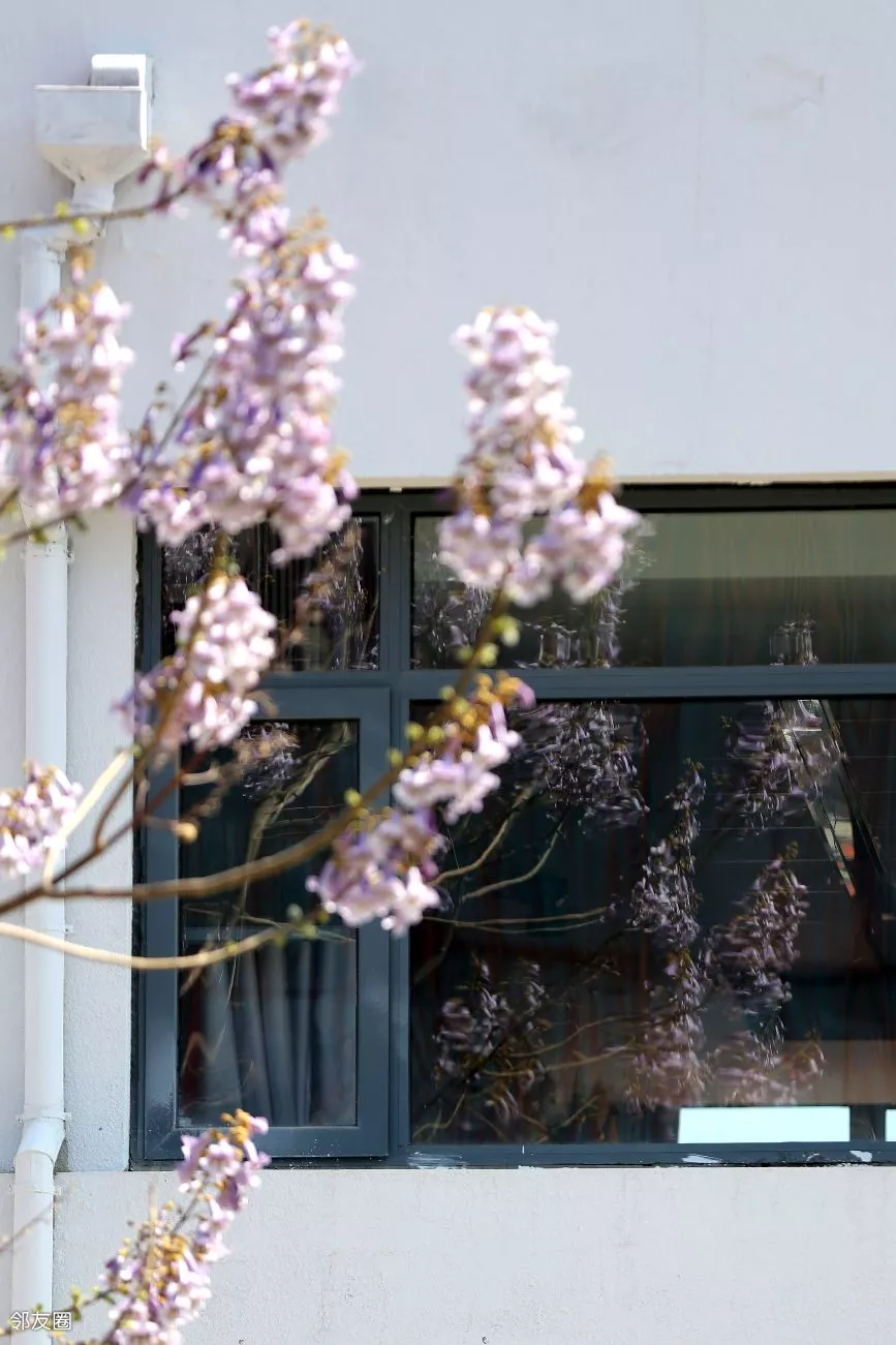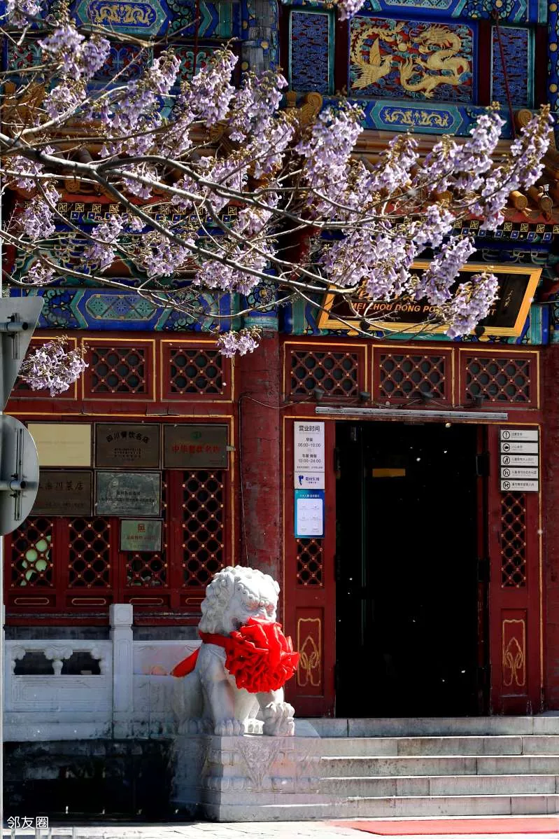 在一家酒店的门脸处,拍出古建和桐花同框的效果