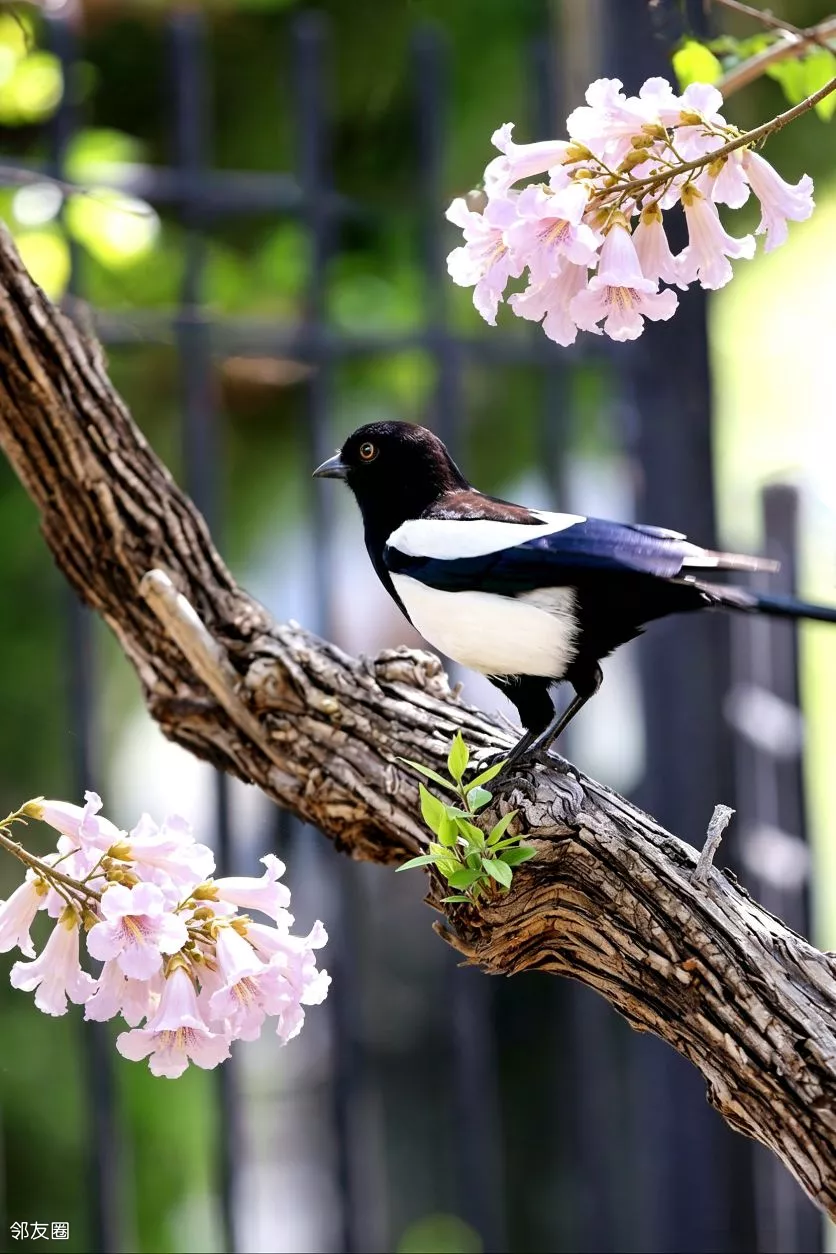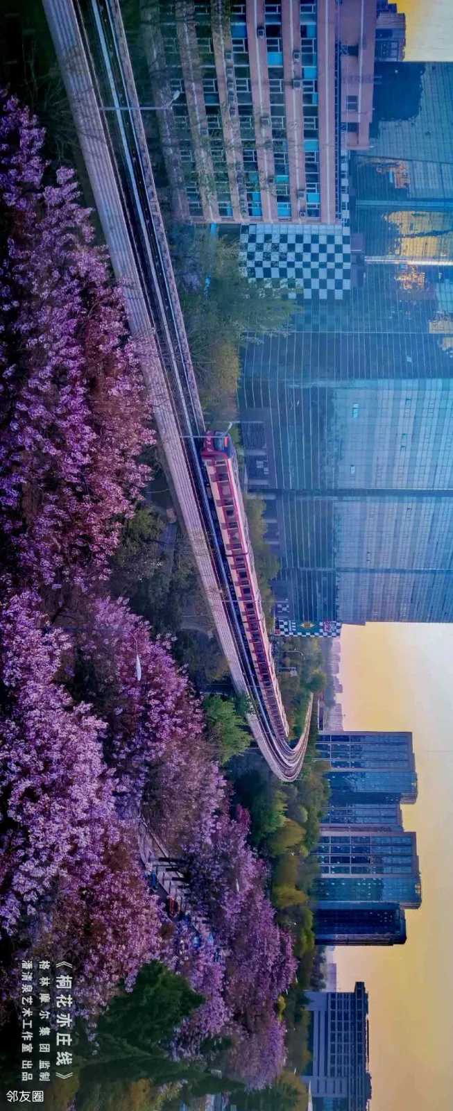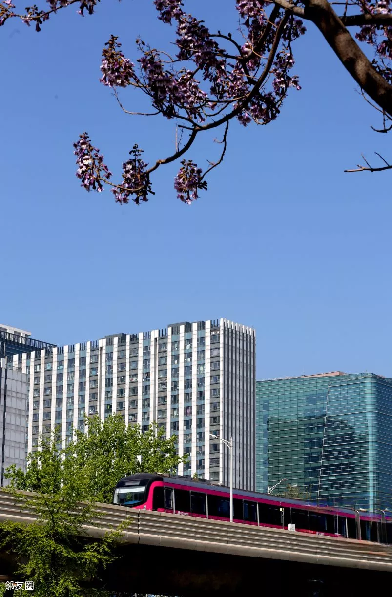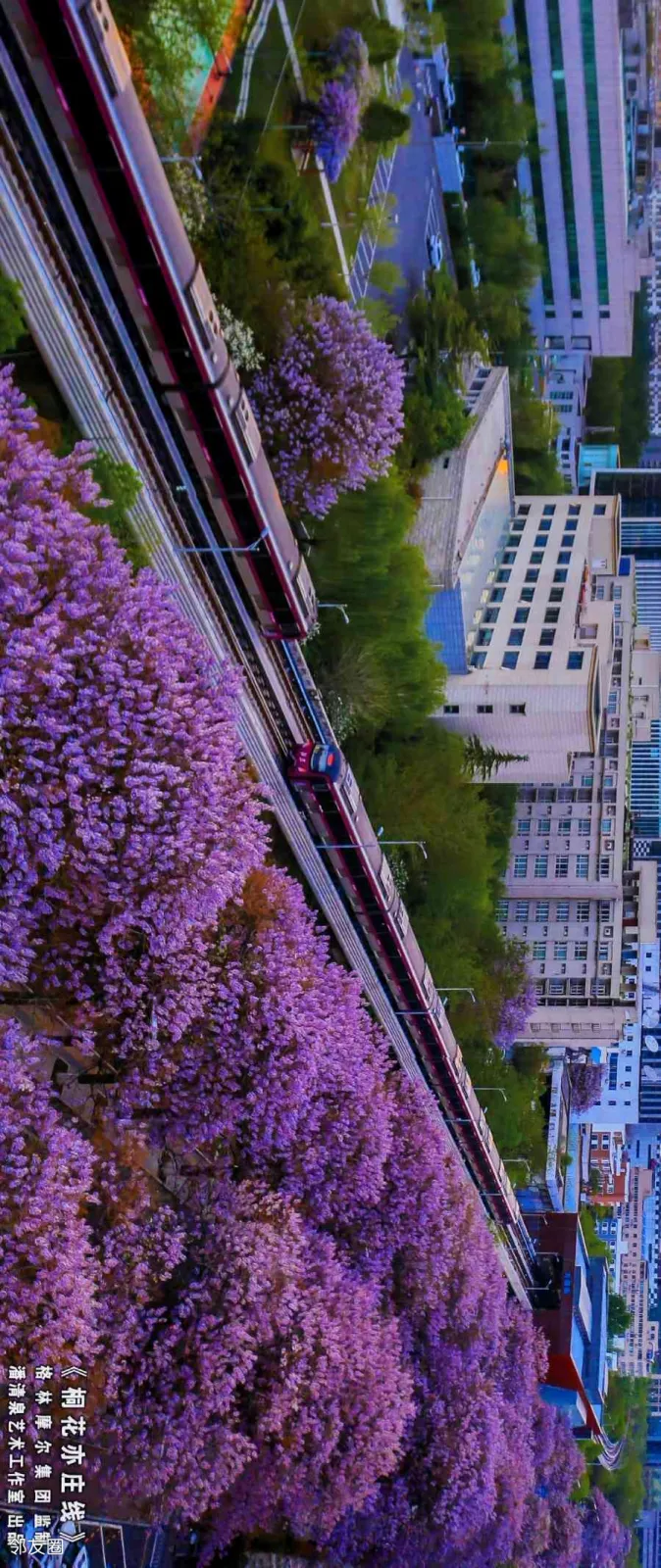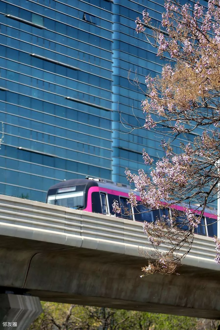 地铁列车跟桐花同框