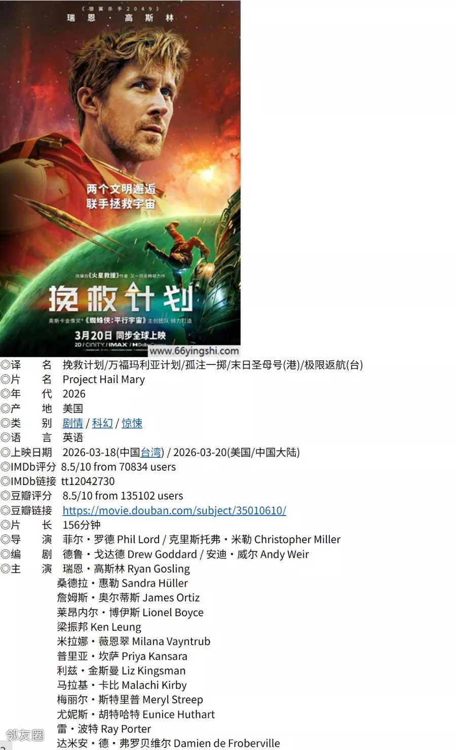 【挽救计划】在北美票房大卖。电影港(www.dygang.net)已经开放了这部电影的下载资源。 【剧情梗概】未来,一种叫噬星体的微生物疯狂吞噬太阳能量,地球将在30年内进入冰河时代。人类启动“挽救计划”,派飞船前往12光年外的天仓五星系寻找解药。瑞恩·高斯林饰演的中学科学老师瑞恩·格雷斯,在太空舱醒来时记忆全失,孤身漂泊。随着记忆恢复,他发现自己是拯救地球的唯一希望。更意外的是,他遇到了外星工程师洛基——两个完全不同文明的个体,从语言不通到生死相依,联手破解宇宙级死亡谜题,拯救两个文明。