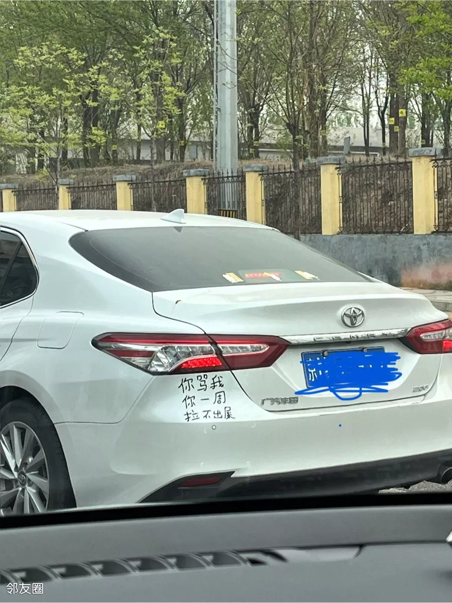 我放大看了看,这个应该不是手写的,像是买的现成的车贴,这个车主够无聊的,太难看了……