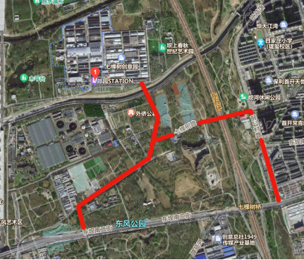 路线一:由半截塔路桥头向北,直接驶入七棵树创意园停车场,停车后步行即可进入郎园Station