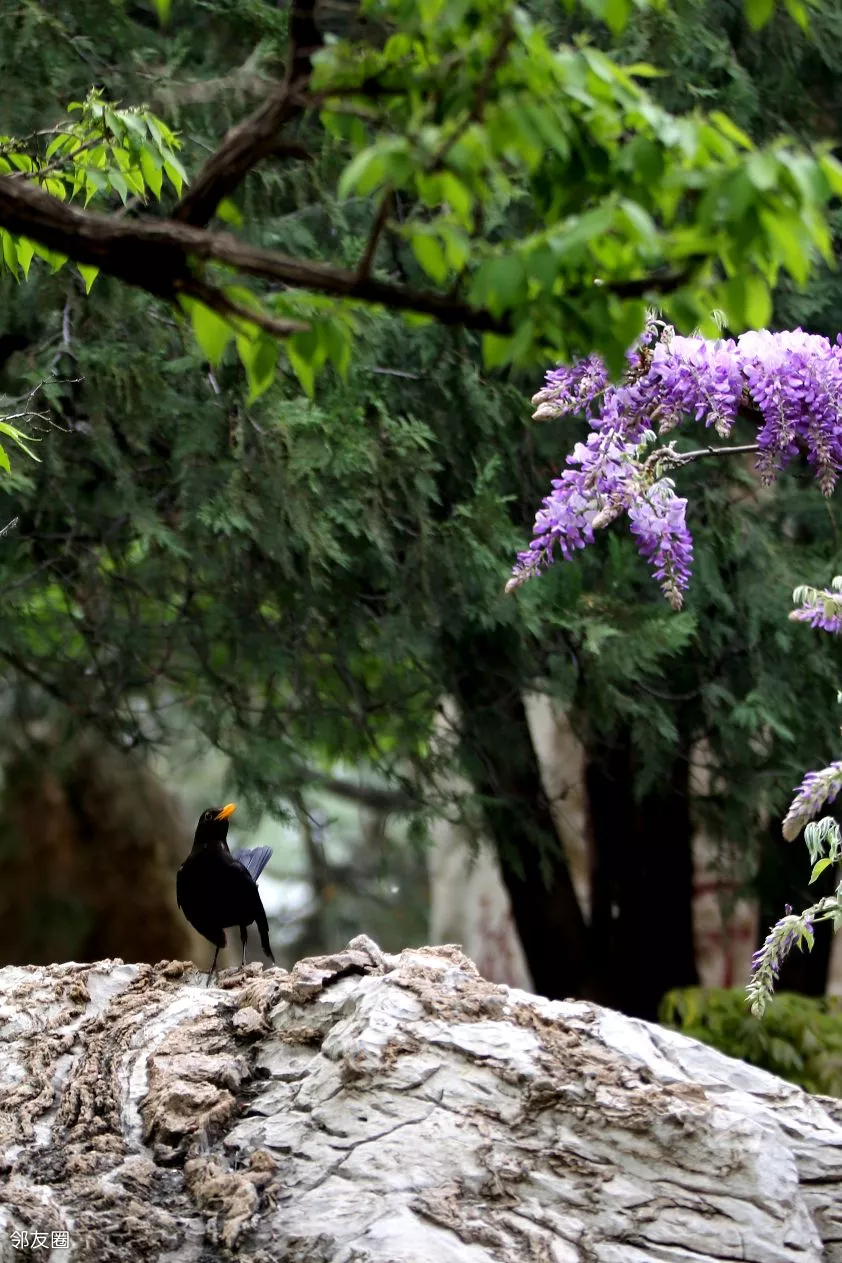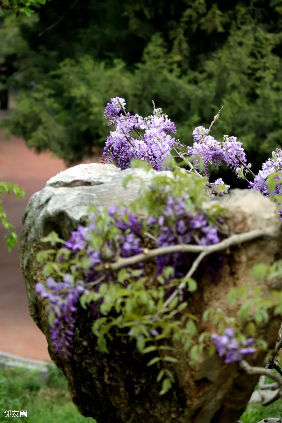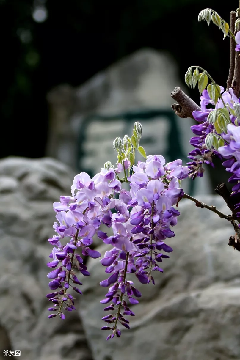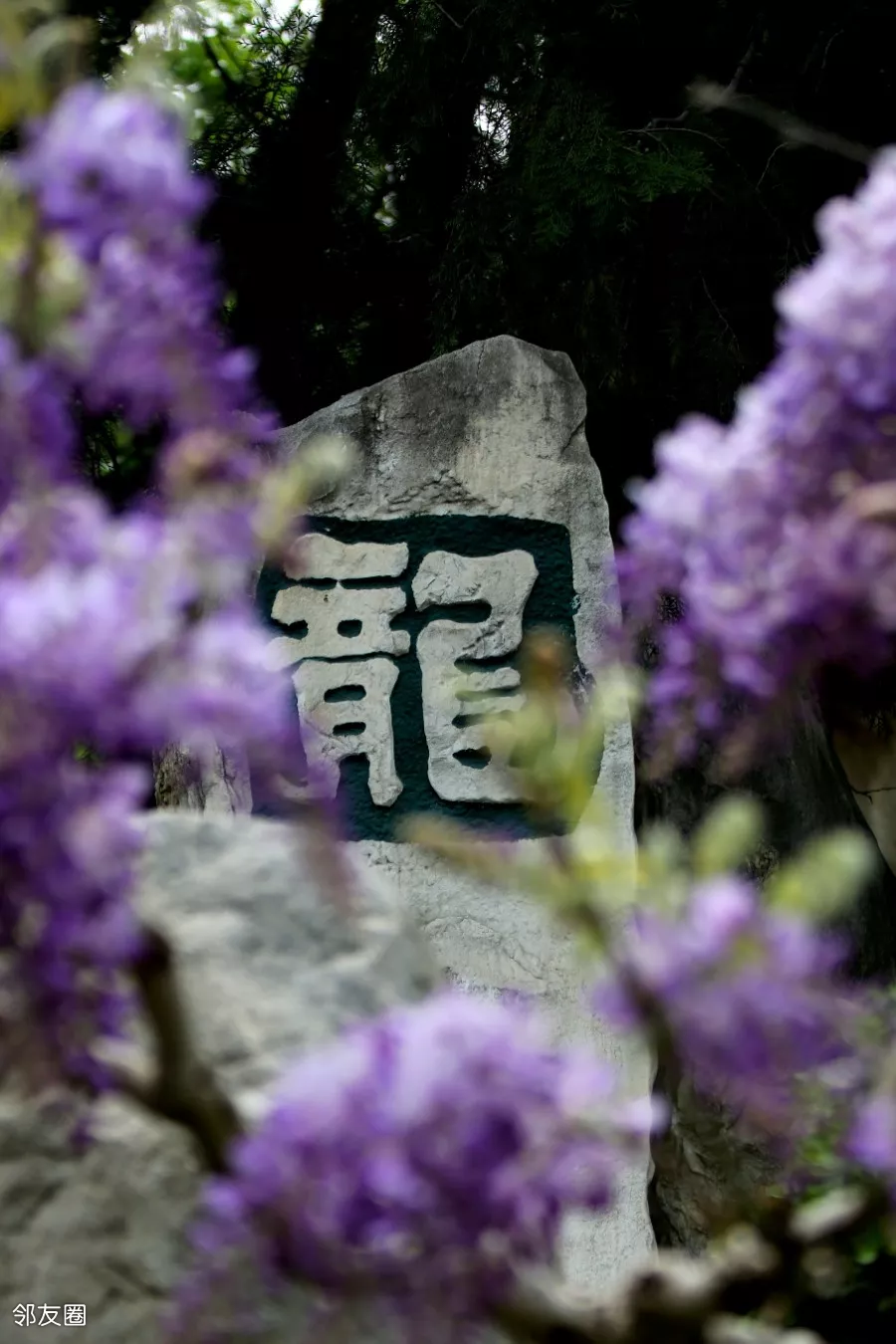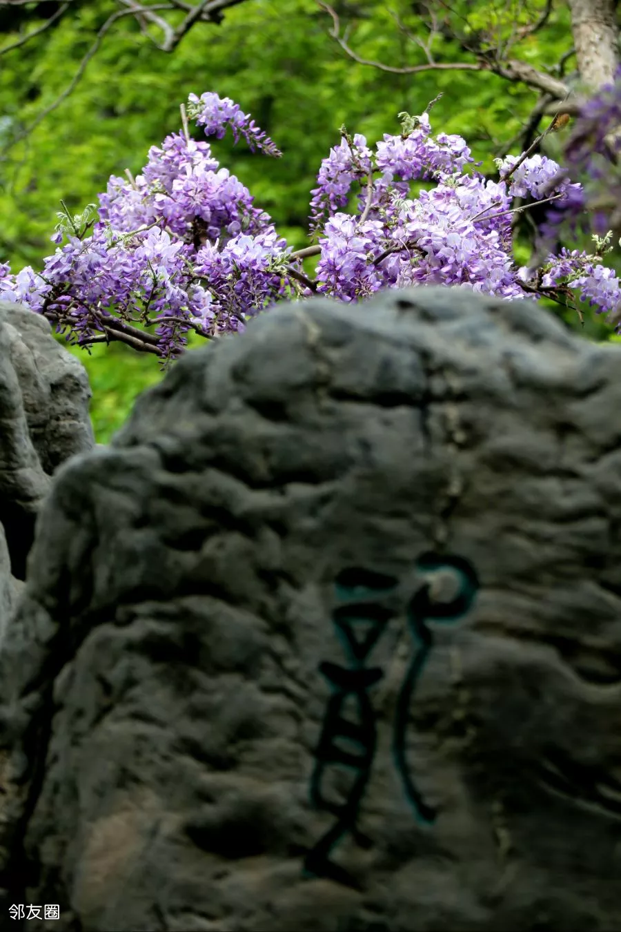 在龙字石林的一角,有数株紫藤,老干遒劲,攀石附岩,春末夏初,万花齐发,宛如石头上流下许多紫色的瀑布,意境不俗。蜂、鸟齐至,活脱脱一幅花鸟国画。