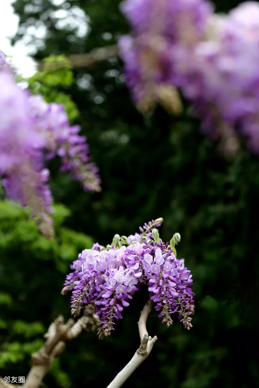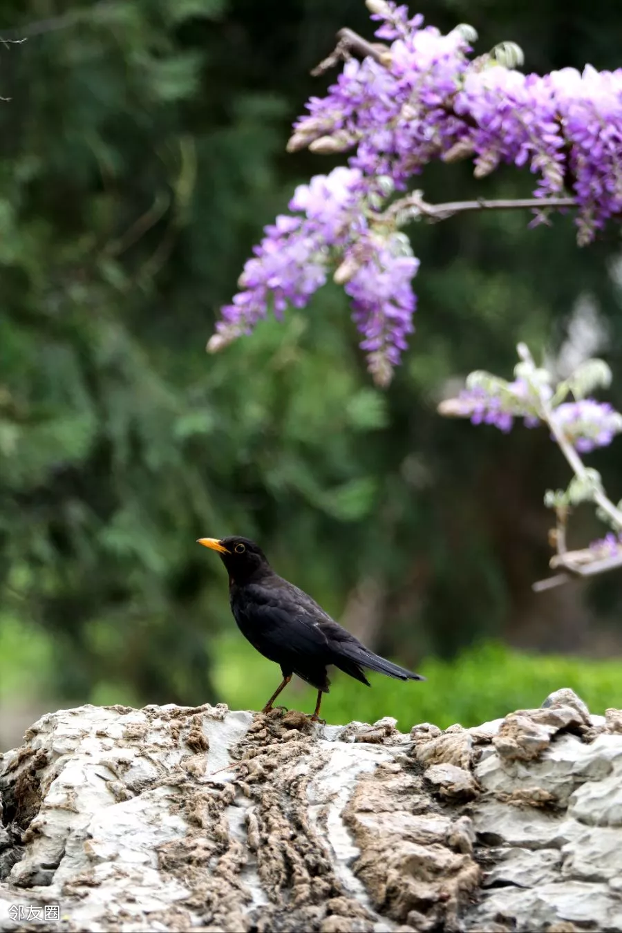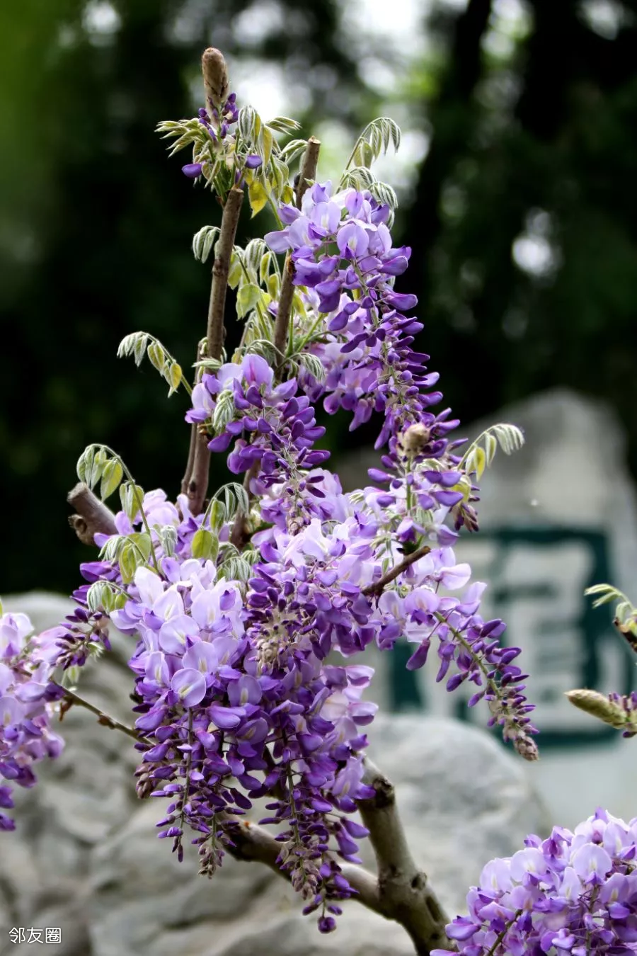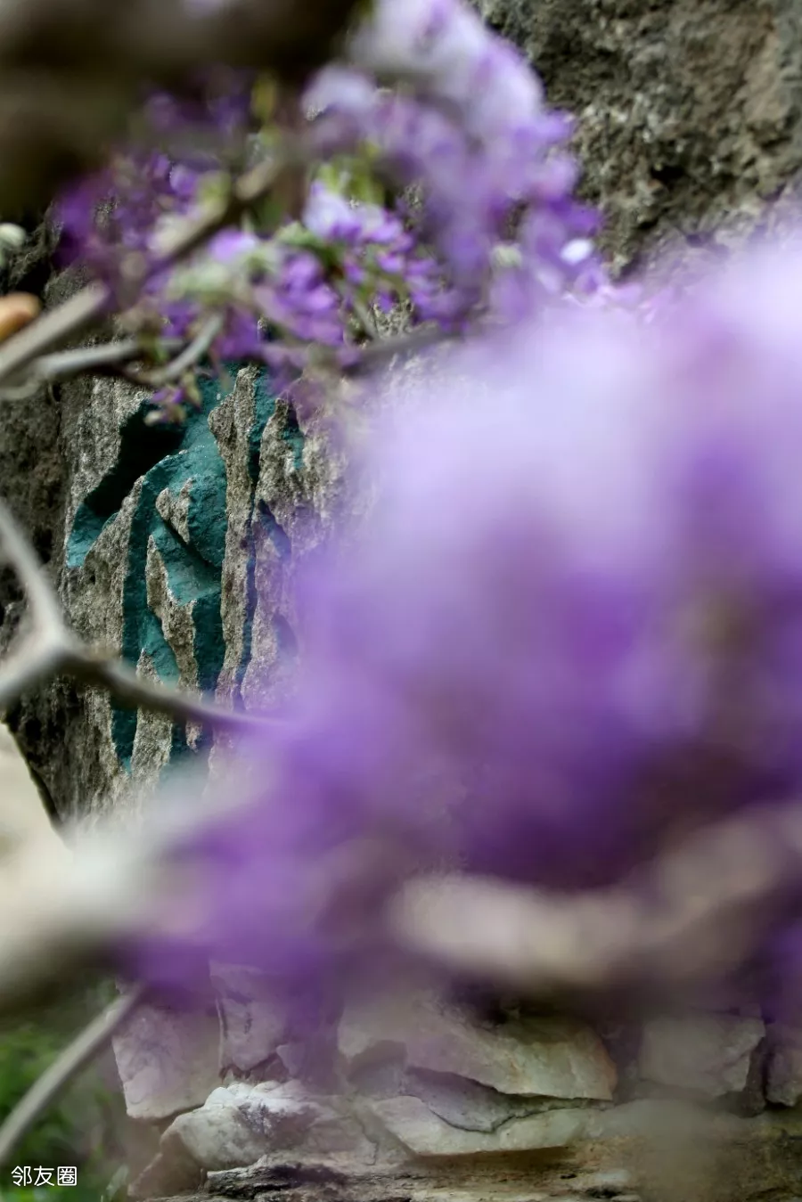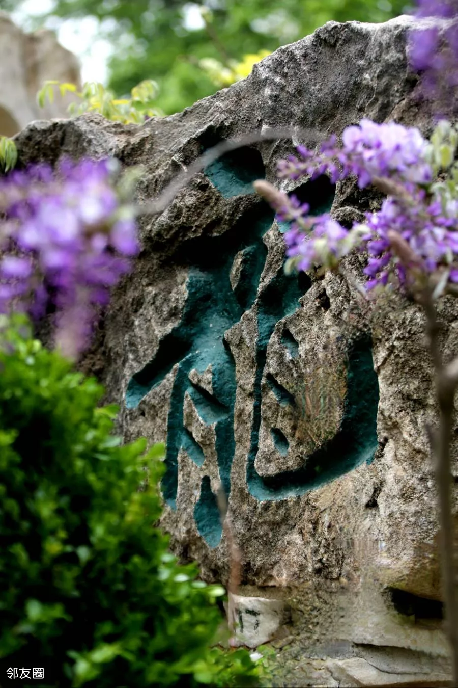 在龙字石林的一角,有数株紫藤,老干遒劲,攀石附岩,春末夏初,万花齐发,宛如石头上流下许多紫色的瀑布,意境不俗。蜂、鸟齐至,活脱脱一幅花鸟国画。