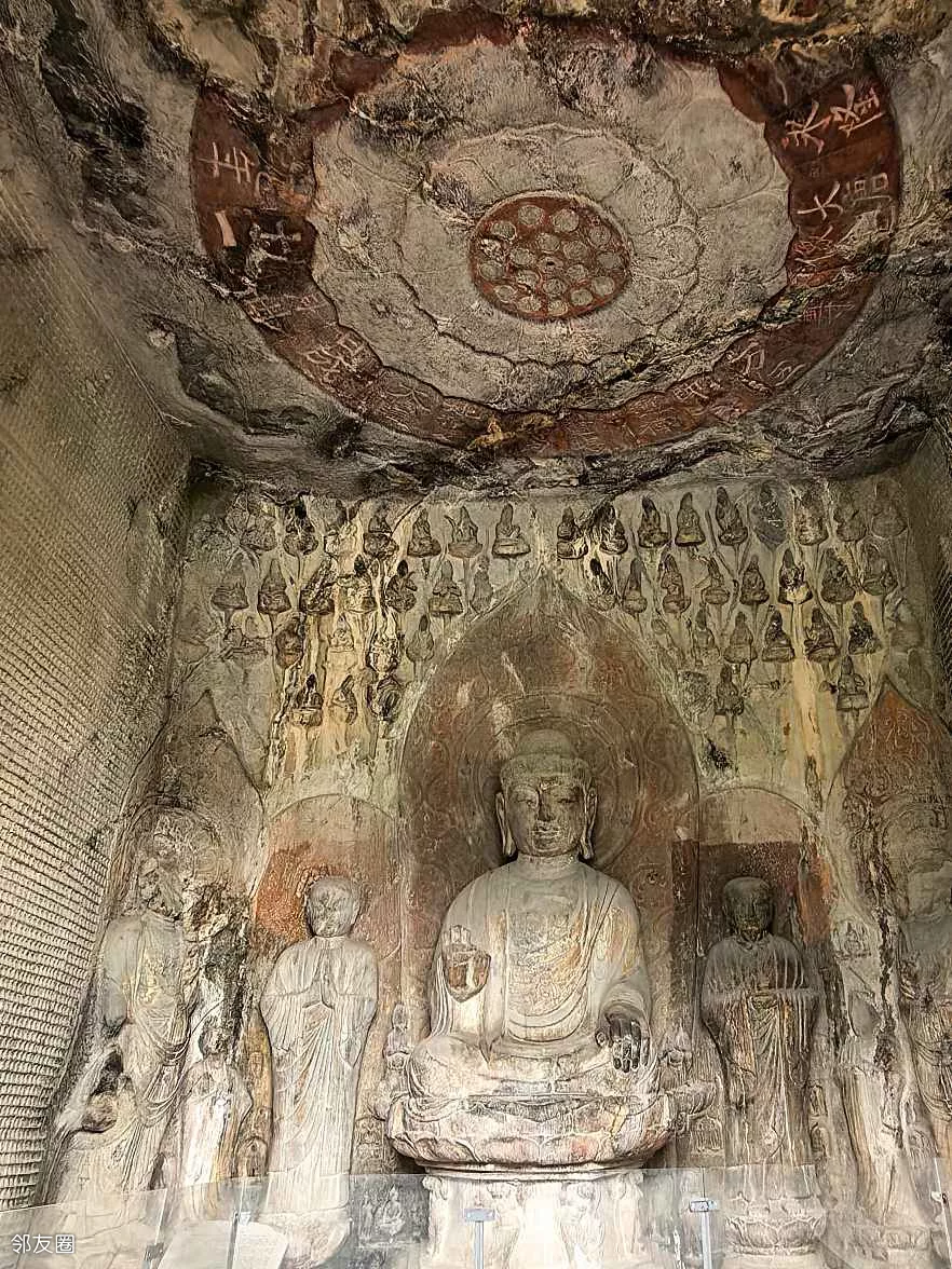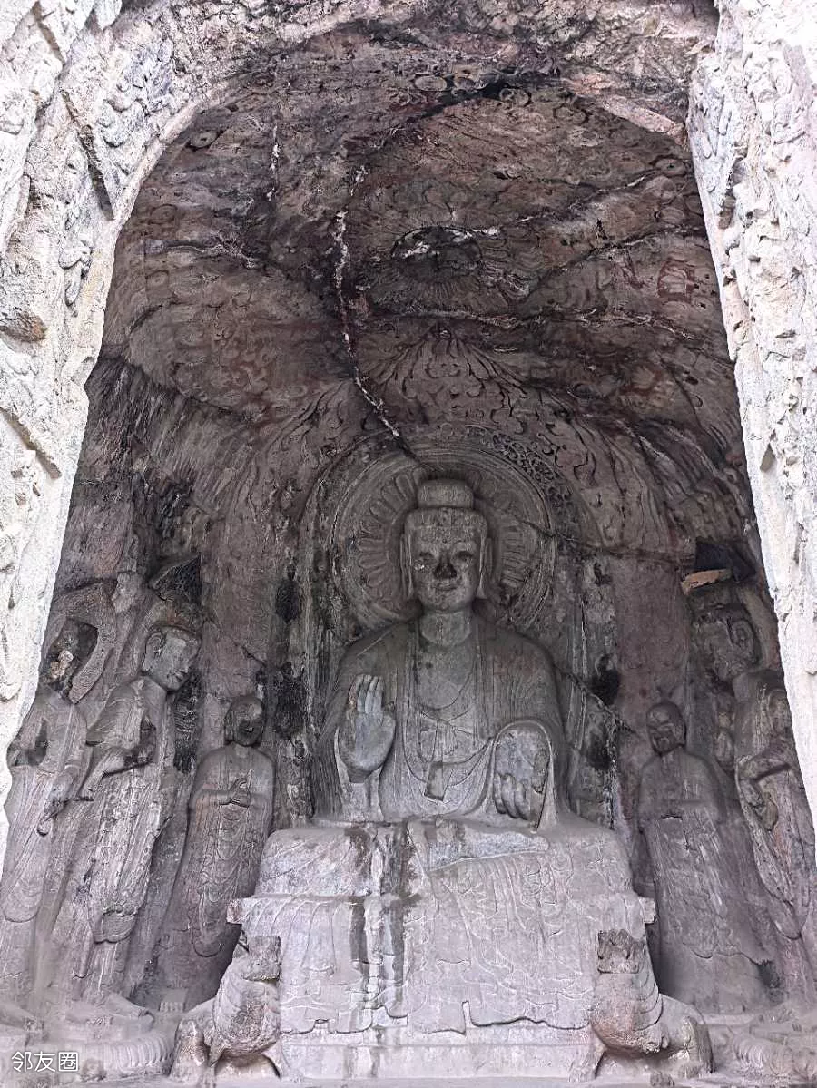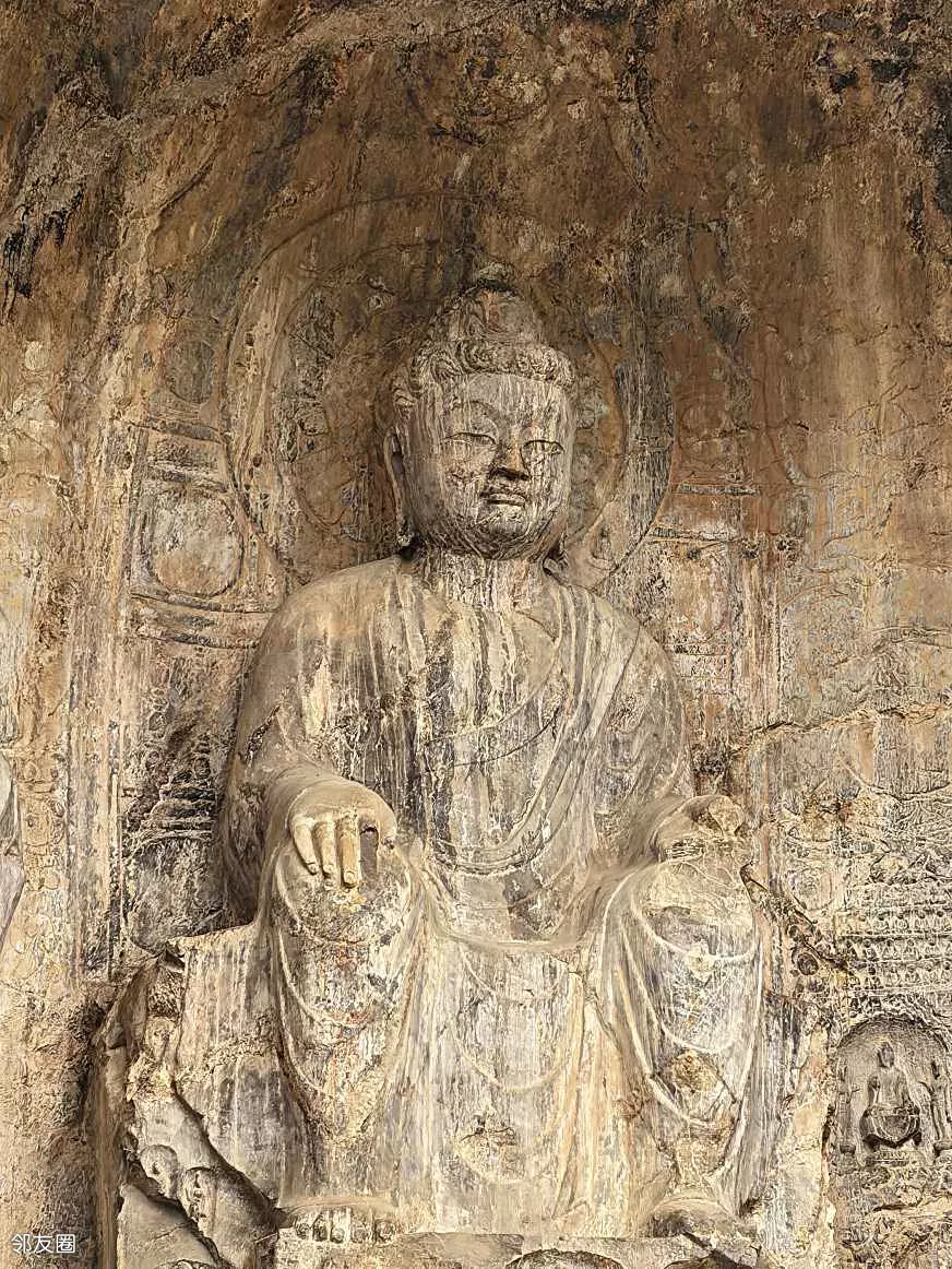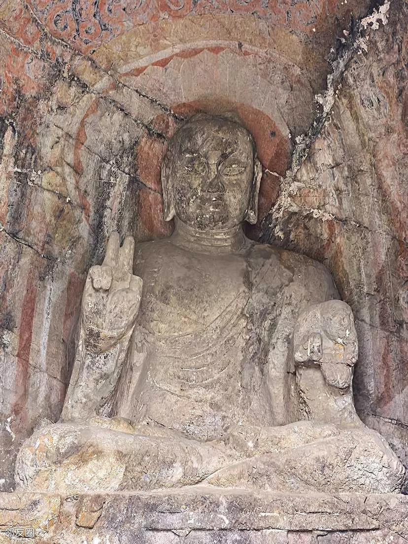 宾阳北洞:主佛双手呈平分指天地的佛教手印,因右手姿势形似现代“剪刀手”而经网络传播引发关注,被称为“剪刀手”佛。