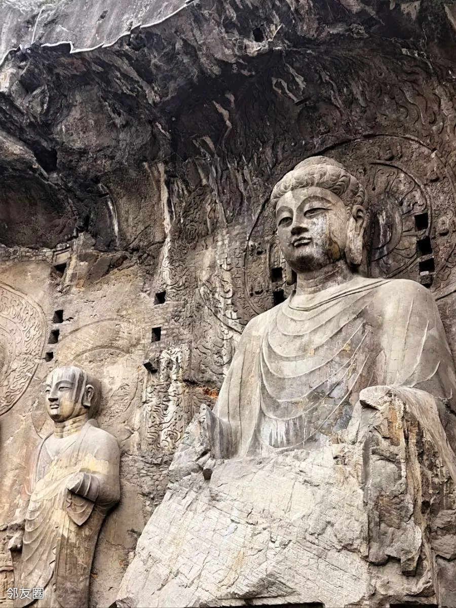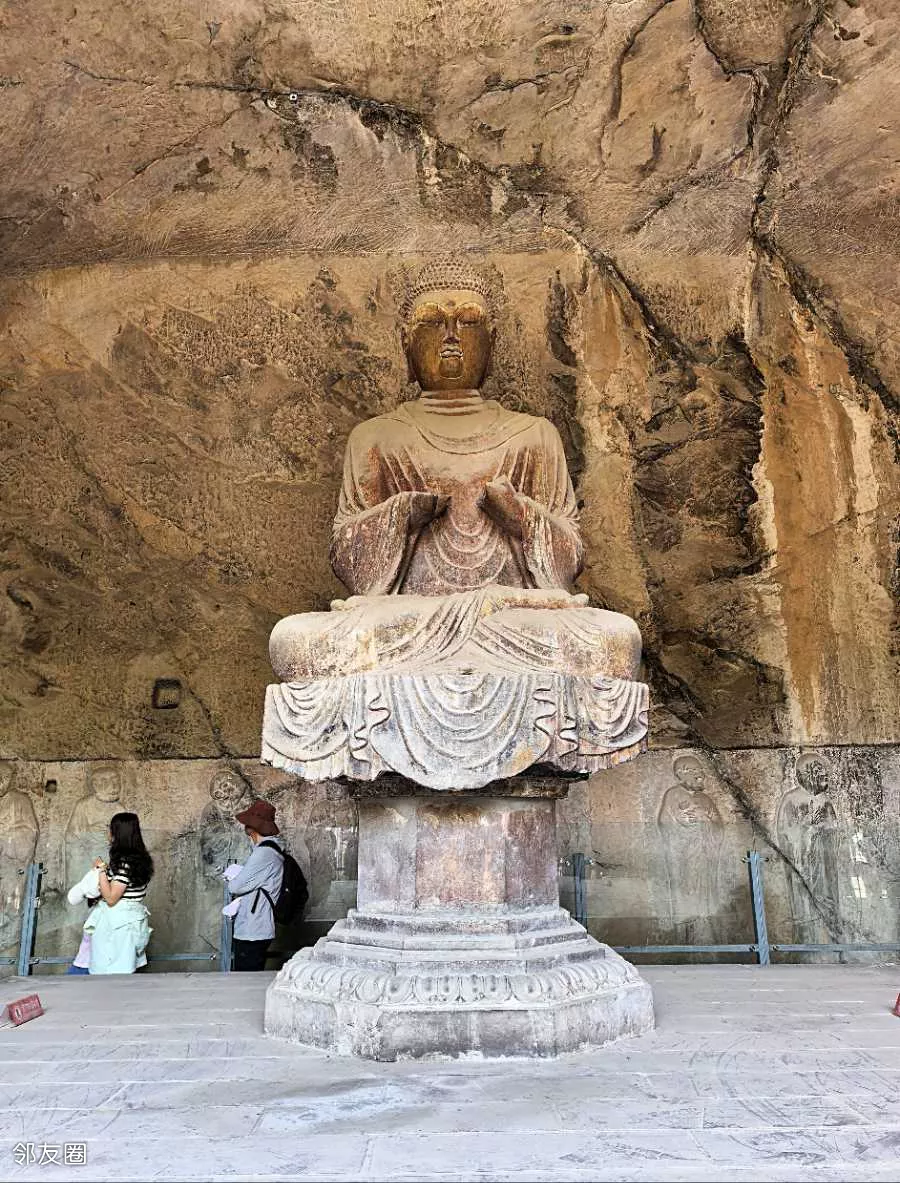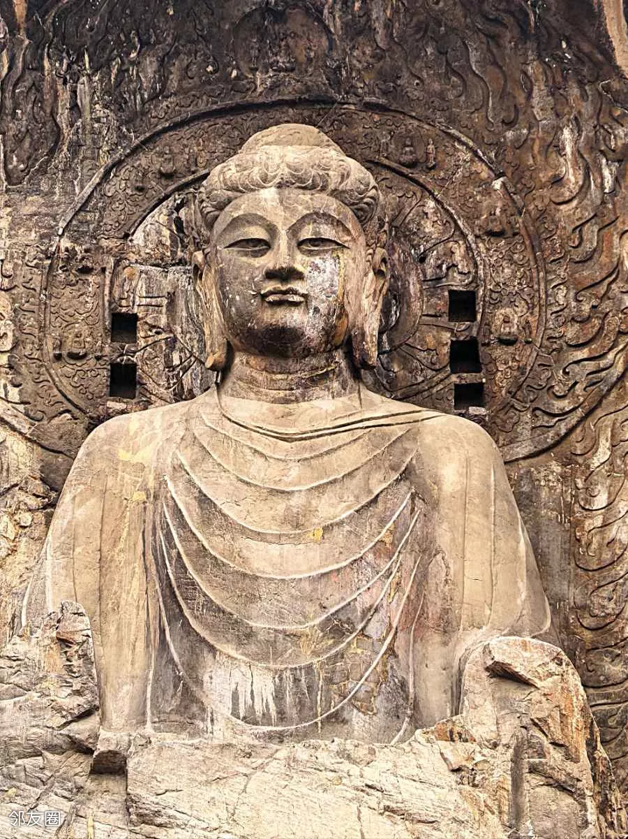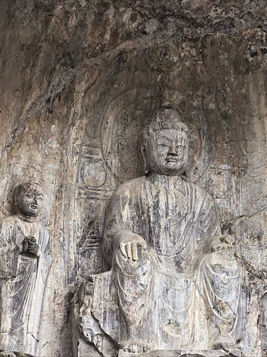 宾阳北洞:主佛双手呈平分指天地的佛教手印,因右手姿势形似现代“剪刀手”而经网络传播引发关注,被称为“剪刀手”佛。