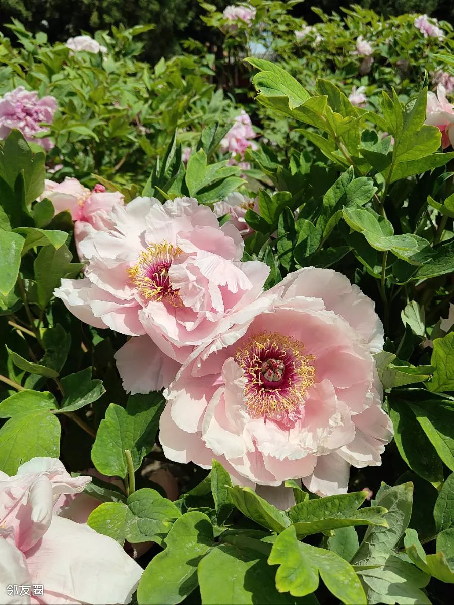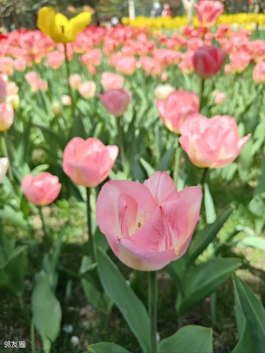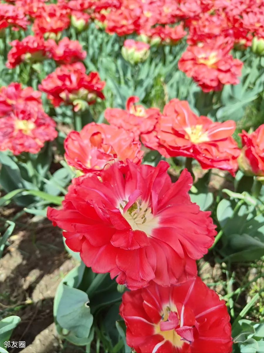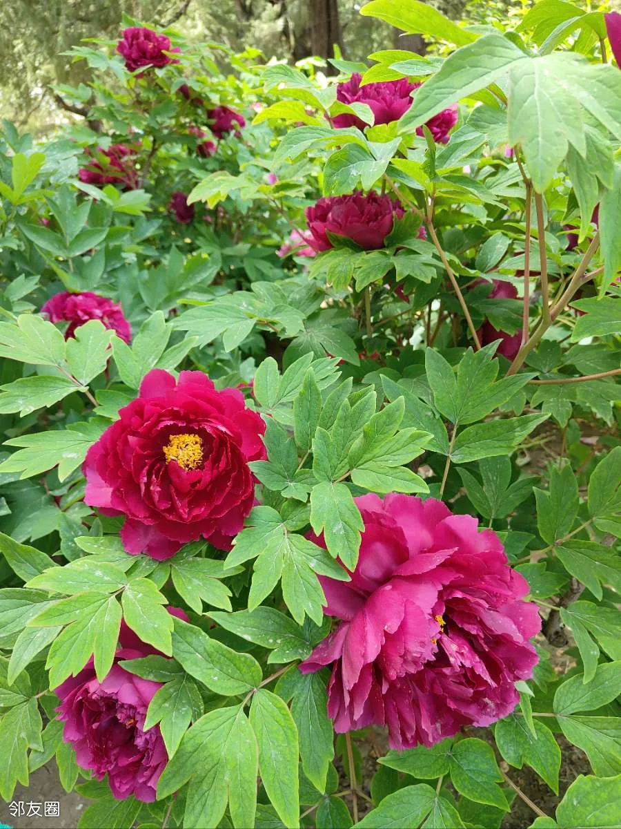 一大片牡丹,绿叶占了多半,花朵只是点缀在绿叶中间。单看一朵花,层次很丰富,好看;但如果是一片花,还是郁金香更好看