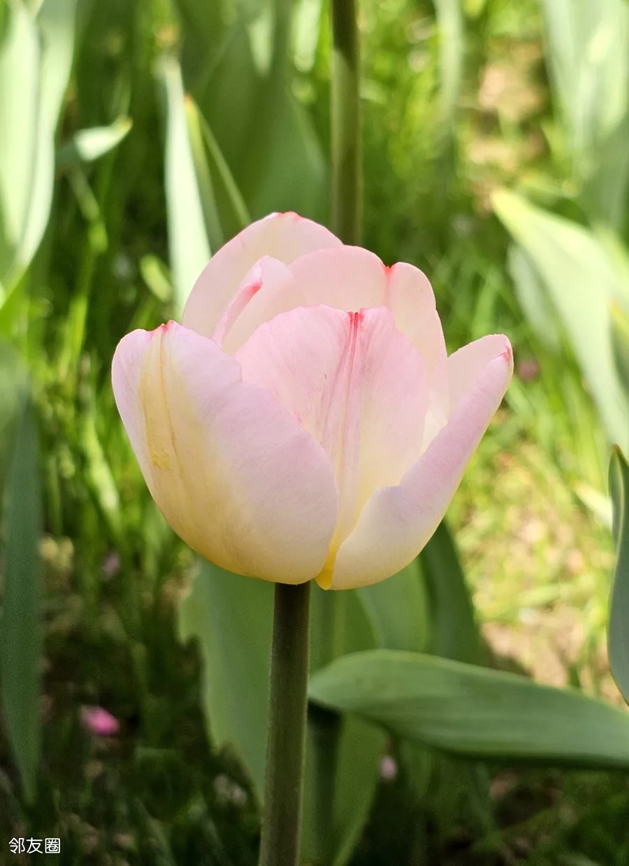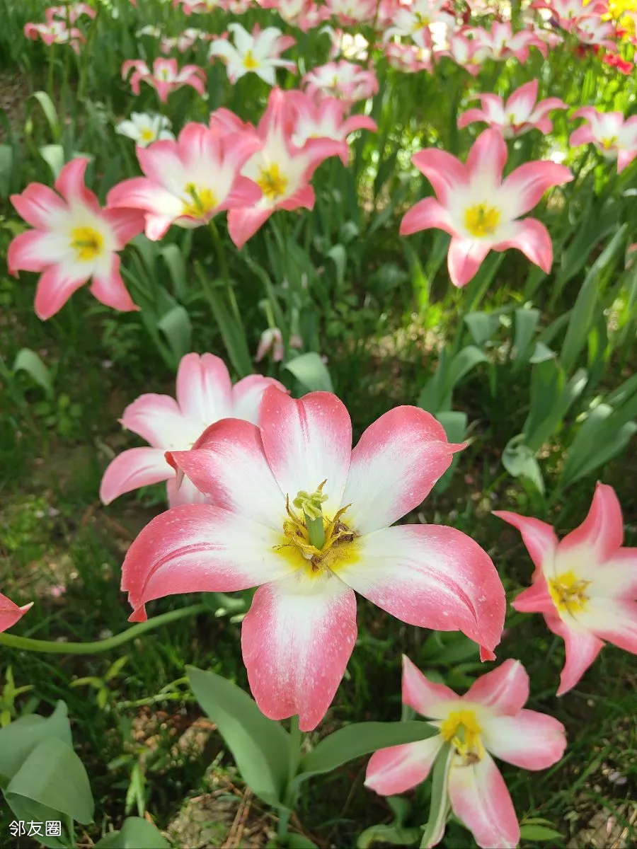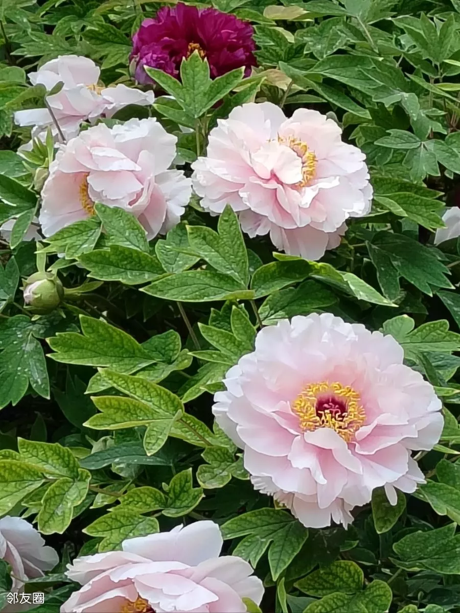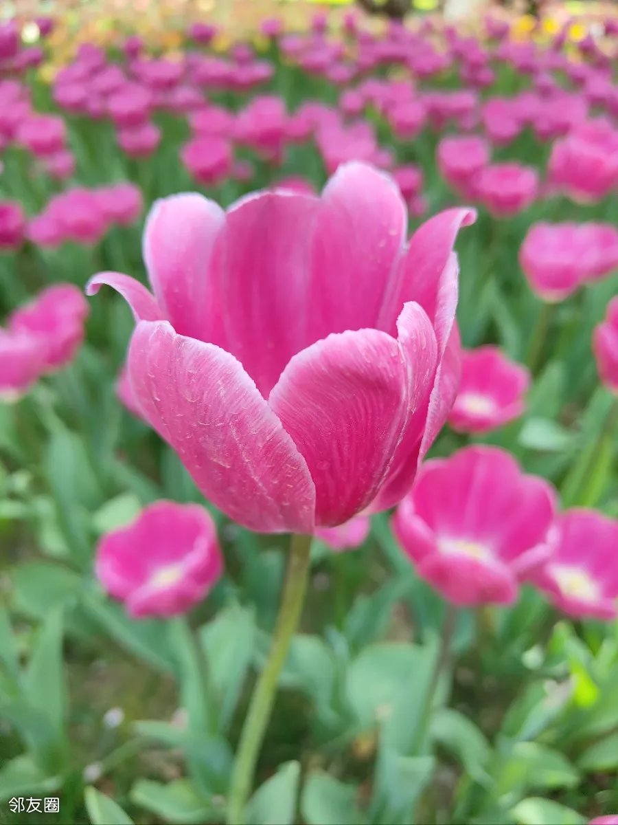 一大片牡丹,绿叶占了多半,花朵只是点缀在绿叶中间。单看一朵花,层次很丰富,好看;但如果是一片花,还是郁金香更好看