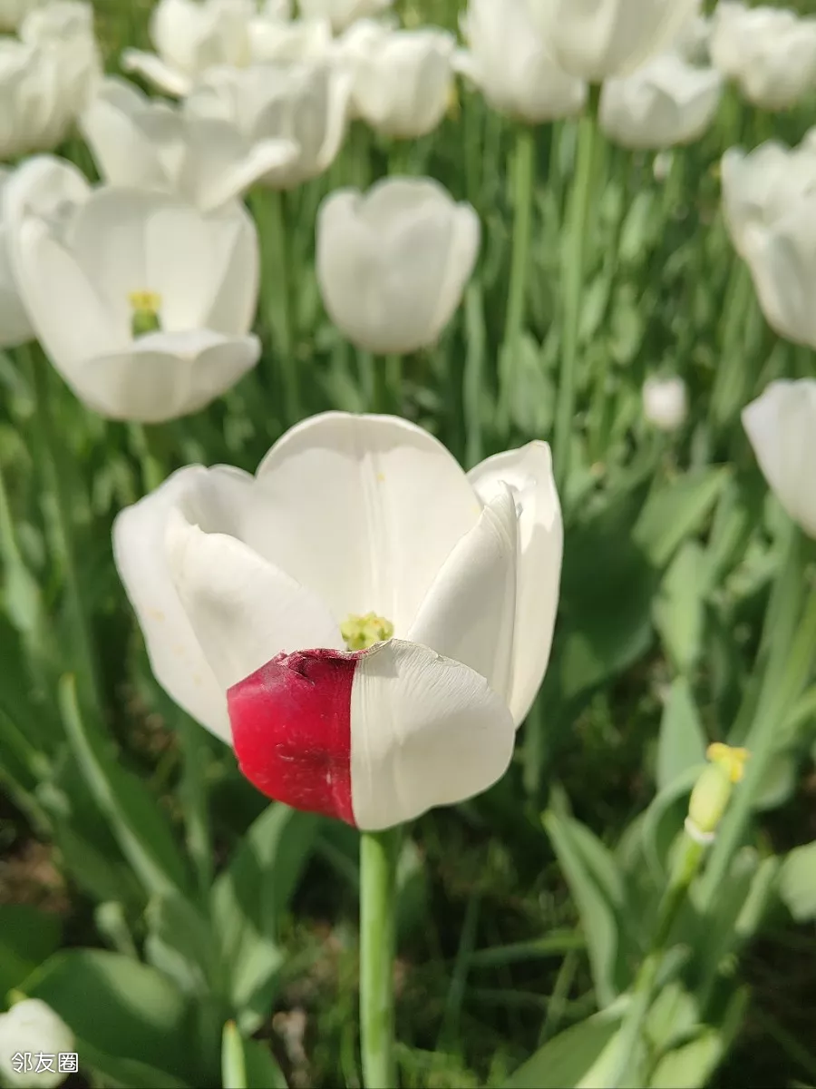 郁金香花期稍微有点过了,不过大部分开的还是不错,怒放中,想拍那种娇滴滴的含苞待放的效果是木有啦。牡丹呢,可能是太阳晒的缘故吧,花瓣儿有点蔫。郁金香区域围了一道绳子;牡丹区域围了两道