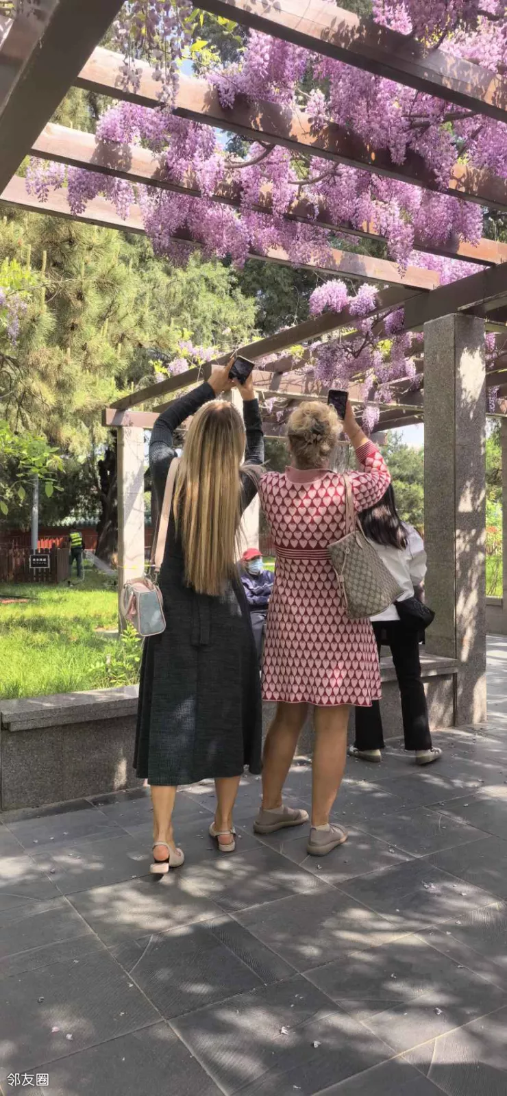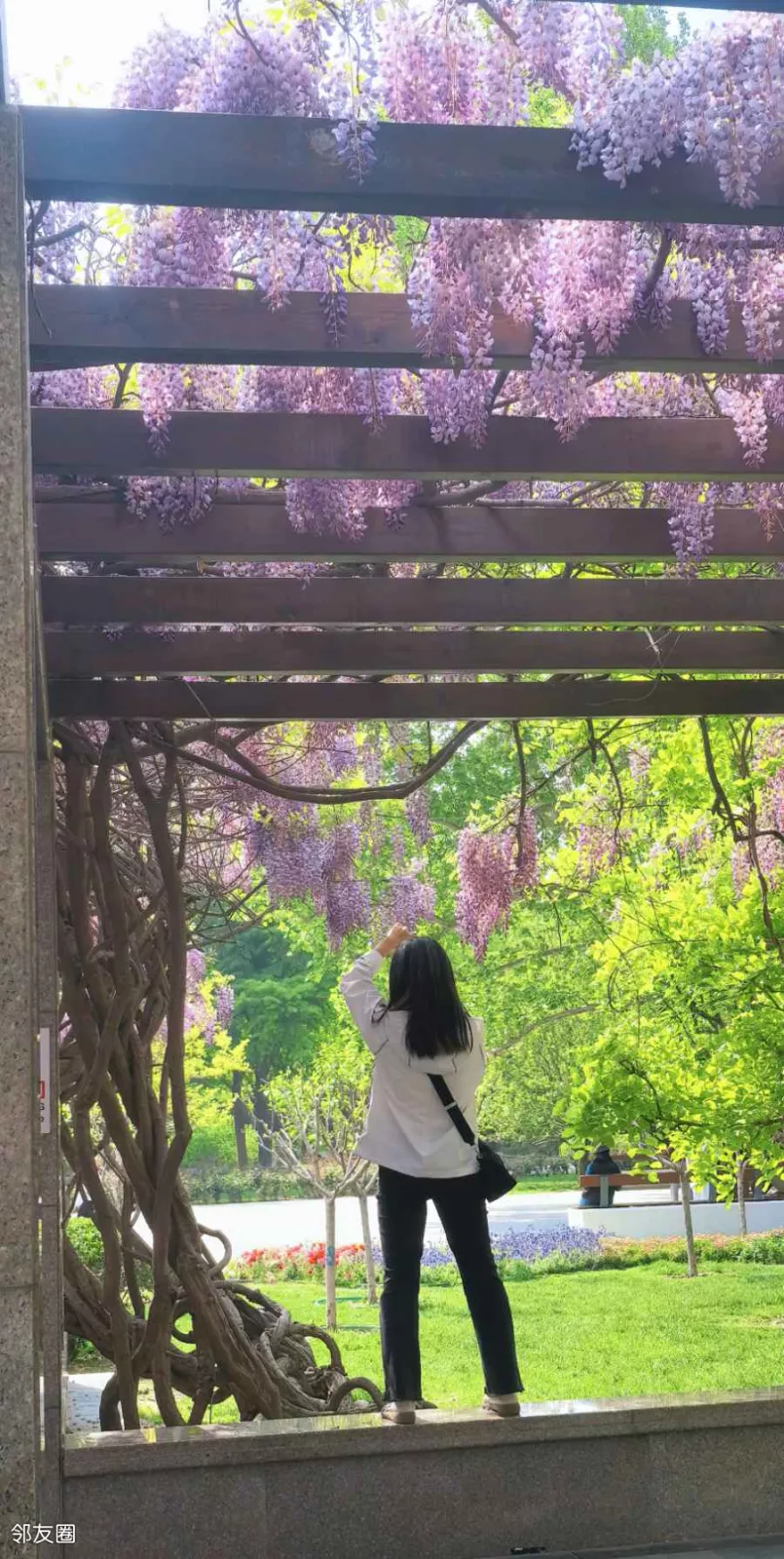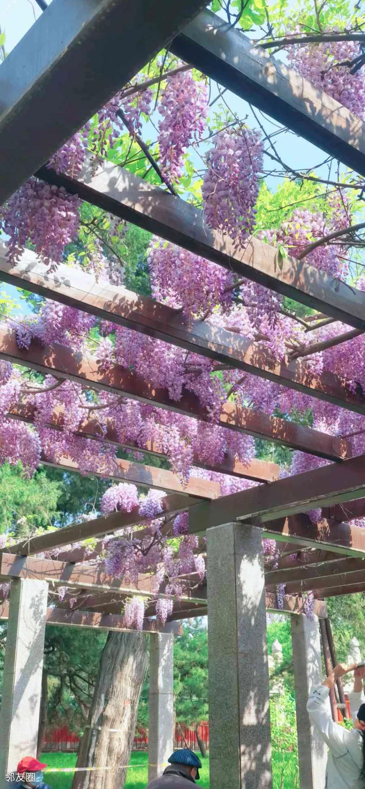 春日的日坛公园,和其他公园比,没有大面积的特色花卉,都是零星的小面积花卉。这里的紫藤也爬满长廊,打造了一份紫色的梦幻浪漫。但是,你想象不到,在这紫藤花开的长廊里有几个老人还在现场版KTV,别说唱的还不错,或许这是别处看紫藤享受不到的免费福利,老外都被这美景吸引了,疯狂拍照。这些不期而遇的美好,都是我春日里最独特的礼物与偏爱,日坛公园的深处,还保留了一份春日难得的清幽……