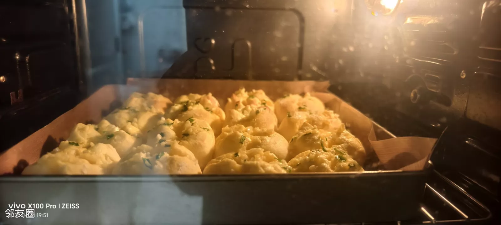 黄油🧈蒜末和香葱末搅拌一下,面包醒发好后表面撒上面粉,然后划十字刀,将配料用裱花袋均匀的涂抹在上面!