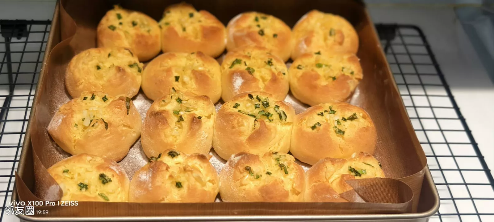 要不咋说吃货都是个幸福娃呢,因为我能变着花样的给他俩投喂各种吃的,就算没胃口,直接来个蒜香小餐包,吃上一口也就开胃了哈哈哈,而且就算没有椰蓉这种香香的材料,烤的时候这个小面包也会很香很好闻,吃着也是多重口感的很好吃!用的还是不用厨师机的面包的做法,结合水合法面包的做法来做的,很简单,咱不用厨师机出手套膜也很轻松~