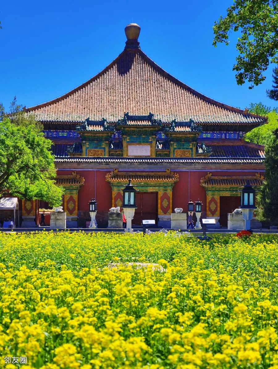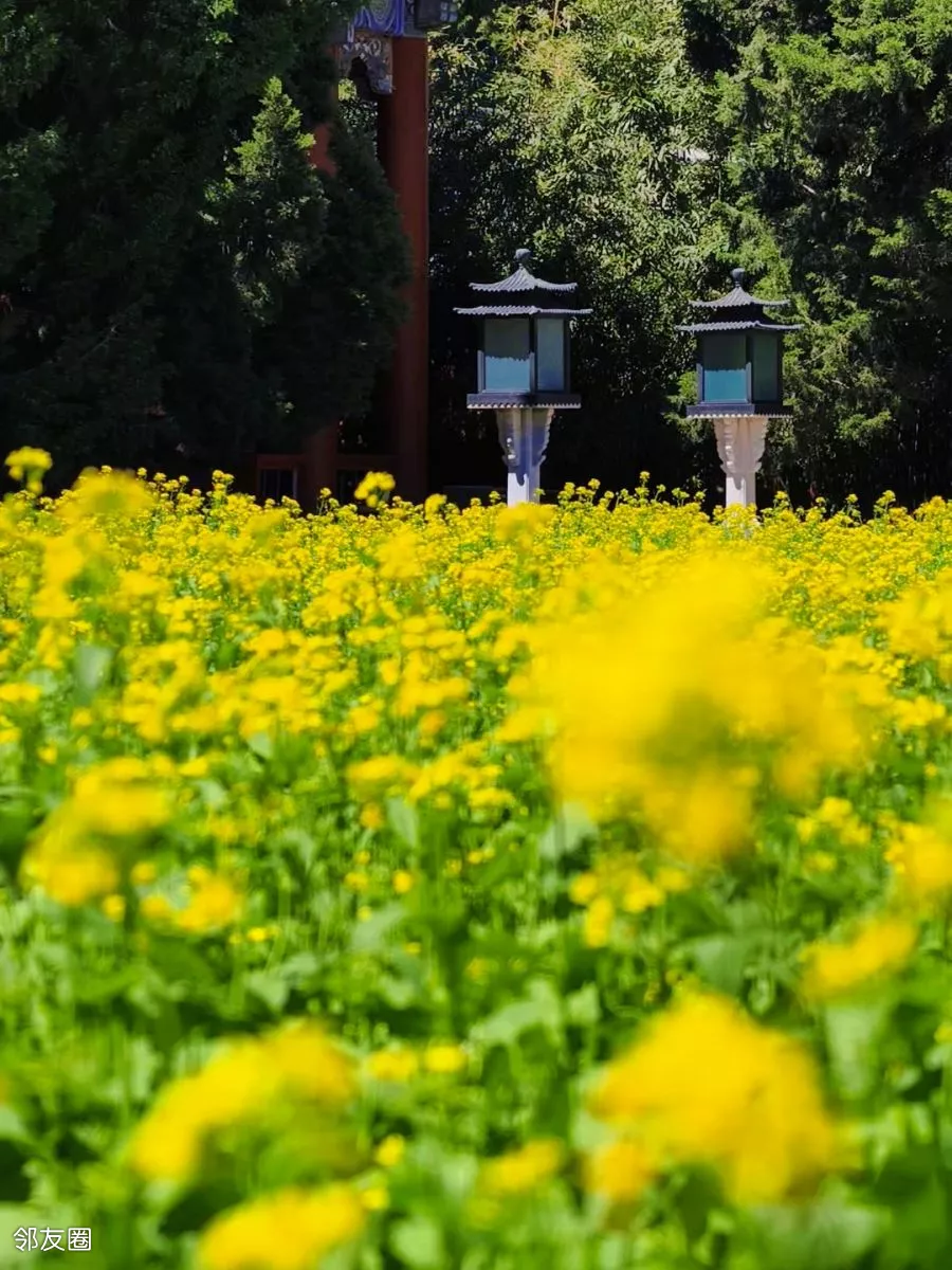 红墙绿瓦下的油菜花格外美
